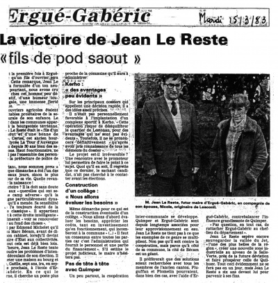 En 1983 il emporte les élections municipales d'Ergué-Gabéric au 2e tour par 51,1% des scrutins contre Marcel Huitric, candidat de la liste de gauche. Du fait de son origine d'enfant d'ouvrier agricole, les journaux titrent "la victoire du fils de pod saout".