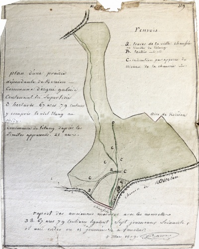 Et il s'agit du plan de localisation de l'étang dressé par le dernier des fils de La Marche qui a conservé la propriété du moulin et qui voudrait également la jouissance de l'étang qui a été englobé dans la métairie voisine. A noter qu'il a également perdu la propriété des ruines de l'ancien manoir familial de Kerfors, et qu'il habite la ville de Quimper (tout comme les acquéreurs, négociants pour la plupart, des biens nationaux).