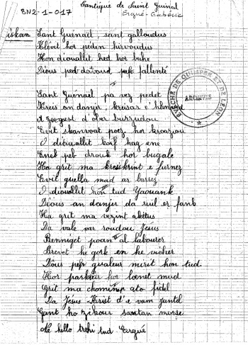 C'est l'archiviste diocésain et chanoine Jean-Louis Le Floc'h qui communiqua à Fanch Morvannou cette copie manuscrite du cantique de saint Guinal, conservée aujourd'hui sous la cote 8N2-1-017, en lui précisant qu'elle est « transcrite manifestement par un enfant ». Nous en publions aujourd'hui le facsimile.