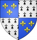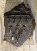 Nous aurions donc du y trouver le motif armorial des trois fleurs de lys surmontées d'une couronne royale, faite également de fleurs de lys. Or le timbre supérieur de la couronne n'est pas très net et le blason est écartelé en 4 parties, en 1 et 4 des fleurs de lys (remplacés par 3 morceaux noircis de vitrail), et en 2 et 3 par des hermines : ces armes sont celles de Claude de France (1499-1524), reine et épouse de François 1er. Par ailleurs le blason est bien entouré du collier de l'ordre royal de chevalerie de Saint-Michel.Par contre, au 2e rang on voit à gauche deux blasons surmontés de vraies couronnes ducales au motif feuillu, sans collier de Saint-Michel. À gauche les armes, en mi-parti des fleurs de lys et des hermines, sont celles de la duchesse Anne de Bretagne, mère de Claude de France, et à droite il s'agit du blason historique « D'hermine plain » du duché.