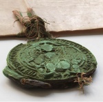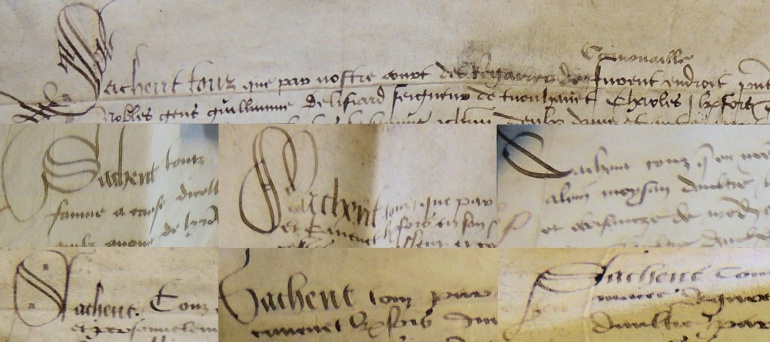 Le document de 1482 a même conservé son sceau bien net malgré sa dimension réduite de moins d'un centimètre. Sous forme d'écu armorié il est de couleur noire, présente dix mouchetures d'hermines ducales posées 4 3 2 1 et est surmonté d'un ornement extérieur érodé et difficile à reconstituer.Quant au texte d'introduction, neuf documents sur onze commencent par cette formule incantatoire « Sachents touz que ... » avec des calligraphies différentes : cf. l'image ci-dessus. Les reproductions de ces parchemins conservés dans le fonds de La Marche des Archives Départementales du Finistère sont publiées in-extenso dans l'article.