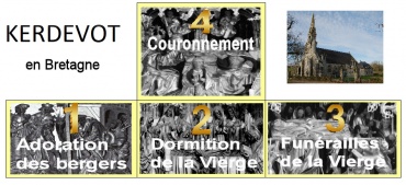 A Kerdévot les panneaux initiaux du retable de la Vierge se présentent aussi comme un T renversé, les deux scènes supérieures latérales ayant été ajoutées plus tard. Et la présentation est très similaire à celles de Ternant : registre inférieur avec ses 3 scènes centrées sur la dormition, scène supérieure avec le couronnement.