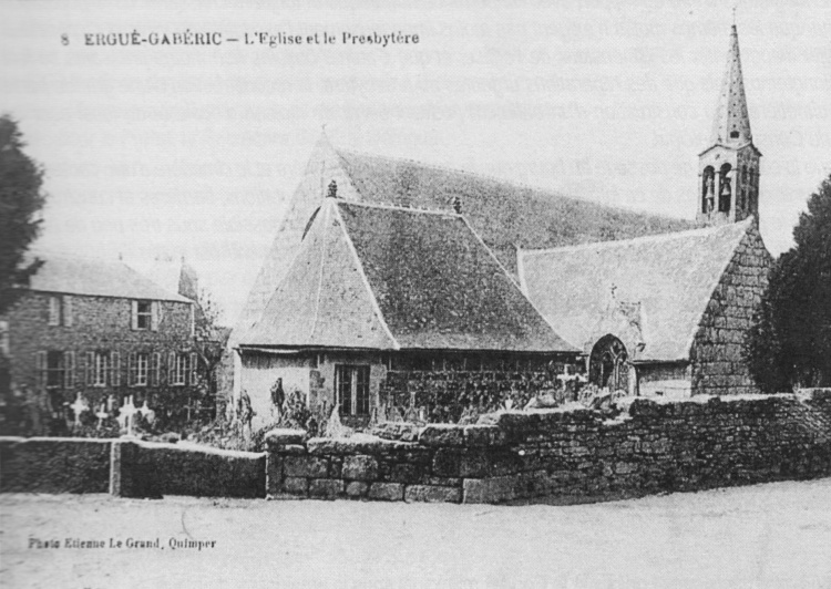 La carte postale libellée « 8. ERGUE-GABERIC - L'Eglise et le Presbytère / Photo Etienne Le Grand, Quimper » a été publiée dans un bulletin municipal de 1980. Le cimetière de l'église paroissiale n'est pas encore transféré près du château de Pennarun, ce qui confirme une datation antérieure à 1922. Comme le photographe ne signait ses cartes postales de son nom qu'après 1920 après avoir été retoucheur de 1899 à 1914 chez Joseph Villard, on peut donc proposer la date intermédiaire de 1921.