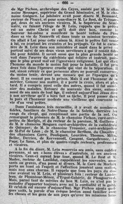 « Lui qui était l'homme du monde le moins fait pour la bataille, il fut pris par deux fois dans l'épreuve cruelle qui vient de la Séparation Mais parmi tant de mérites du bon M. Lein, ce n'est pas le moindre d'apporter toujours avec soi la cordialité et la gaité ». À Landeleau il connait la lutte contre la loi de la Séparation des Eglises et de l'Etat, ce qui lui a vaut un procès en 1906 à Chateaulin, rejugé à Rennes suite à appel du ministère public. Son vicaire de l'époque est condamné à la prison. Quant à lui, les juges sont plus cléments : il est condamné à payer une amende de 200 francs pour outrages au maire et aux gendarmes lors de l'inventaire de l'église. |