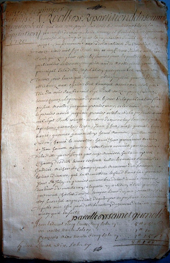 Rolle de répartition de la somme qui doit estre payée par tous les contribuables de la paroisse d'Ergué-Gabéric, terres et prairies despendantes evesché de Quimper pour la capitation de mil sept cents vingt ;conformément aux déclarations du Roy des douze mars mil sept cents un et neufviesme juillet mil sept cents quinze pour estre les sommes pour lesquelles épargner particulier se trouve compris audit rolle, tant pour le principal de la ditte capitation que pour les vingt un derniers pour livre, qui doivent estre proposés pour les droits attribuez aux officiers des fouages [1] ... par édit du mois de novembre mil sept cents onze, payés en deux termes égaux, le premier de prix le jour de la publication du présent rolle, jusqu'au premier may, et le second requis le premier aoust jusqu'au premier octobre de la présente année mil sept cents vingt