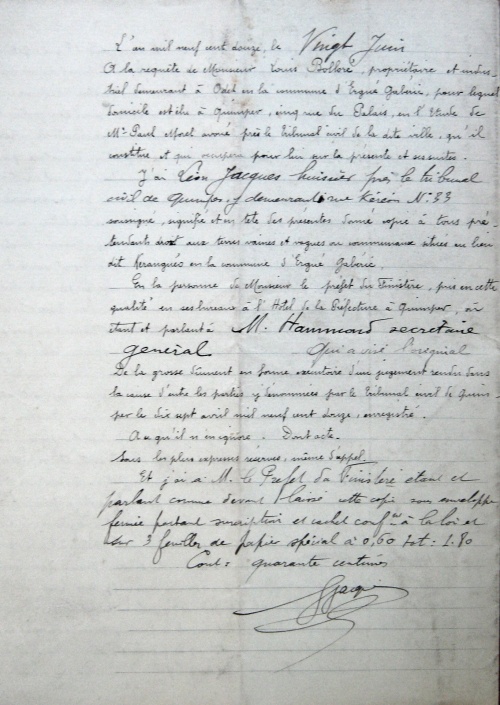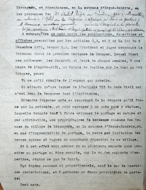 J'ai, Léon Jacques huissier près le tribunal civil de Quimper, y demeurant rue Kéréon, 33, soussigné, donné assignation à tous prétendants droit aux terres vaines et vagues ou communaux situés au village Kéronguéo, et dépendances, en la commune d'Ergué-Gabéric, en les personnes de : Mr Chaleil, Préfet du Finistère, pris en cette qualité en son cabinet à l'Hôtel de la Préfecture à Quimper, où étant et parlant à M. Hammont secrétaire général qui a visé l'original de la présente, et par copie séparée à M. le Maire d'Ergué-Gabéric et par copie affichée à la mairie de la dite commune.