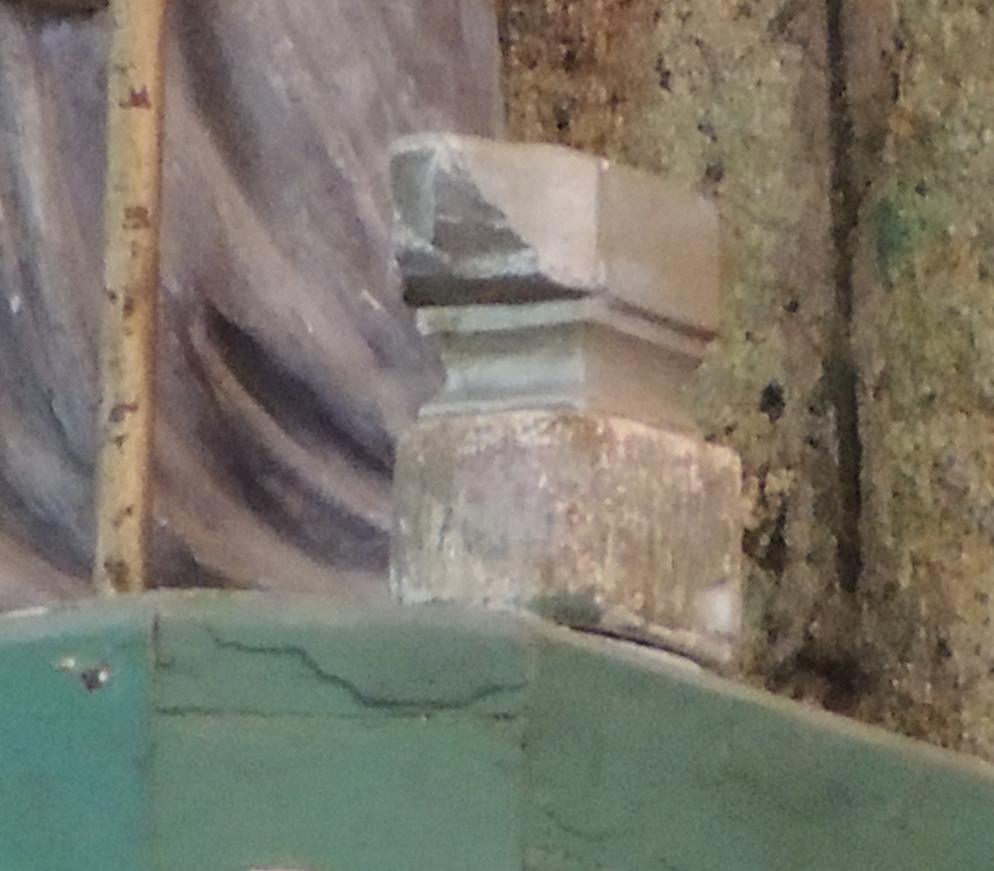 À ses pieds est posée une petite enclume de forgeron, cet attribut donnant une symbolique complémentaire. En effet on retrouve là le culte d'un saint populaire dans le diocèse de Quimper, formant une figure composite des saints Eloi[1]