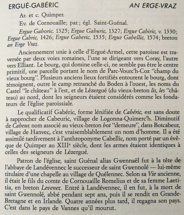 Les noms Ergué-Armel et Ergué-Gabéric sont expliqués à la page 66 et 67. On y apprend l'existence d'un champ "Parc-Vourc'h-Coz" Le champ du vieux bourg qui serait l'emplacement du bourg primitif. B. Tanguy voit dans la forme Gabéric un nom de personne Cabeuric. Il consacre un paragraphe à St Guénal sans accréditer la thèse de sa naissance à Ergué-Gabéric. A noter aussi le nom Benodet (P. 39), on lit avec attention l'explication sur le nom Odet. |