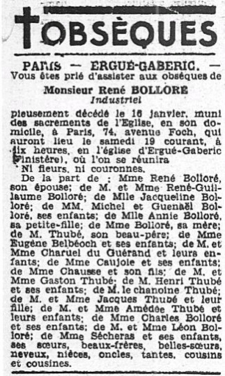 Où il est question du décès de René Bolloré, patron des papeteries, le 16 janvier 1935 en son domicile de l'avenue Foch à Paris et de ses funérailles à Ergué-Gabéric. Autres lectures : « 1935 - Photos des funérailles de René Bolloré » ¤ « René Bolloré (1885-1935), entrepreneur » ¤ |