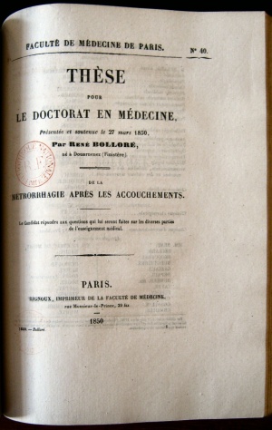 Jean-René Bolloré présente une thèse intitulée « De la métrorrhagie après les accouchements » en 1850 pour obtenir le diplôme de docteur en médecine. Il introduit ainsi son sujet : « On doit entendre par métrorragie (de |