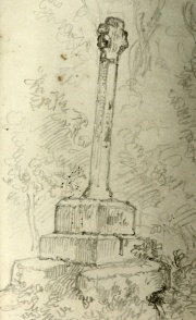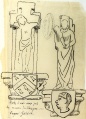 Ce calvaire du 16e siècle, avec un Christ et une Vierge à l'Enfant en exposition sur une croix démunie de ses branches, se trouve actuellement à l'entrée du cimetère sur la tombe familiale des Le Guay du Cleuyou. Sur le socle on y lisait l'inscription « 1553 FUT FET CE CROSE » selon Louis Le Guennec, ou « 1553 FUT FET CEST » selon Y.-P. Castel. Au sommet du fût, on distingue deux écus adossés, l'un représentant un chevron, l'autre une croix potencée, ce dernier blason pouvant être les armes de la famille Cabellic (11e-12e siècles), fondatrice de la commune d'Ergué-Gabéric. On observe également des statues de monstres au-dessous du chapiteau de part et d'autre du fût. |