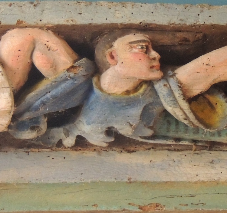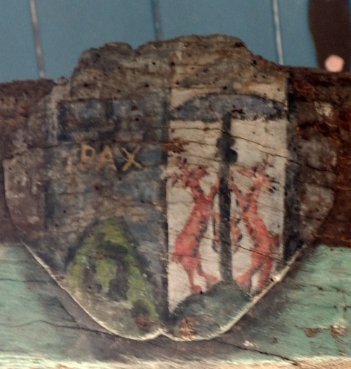 De quand datent les sablières ? Du 16e siècle lors de la fondation de la chapelle ? En 1679 lors de la rénovation du lambris ainsi que l'indiquait une inscription sur le bas-côté sud ? Ou plus tard, voire même au 19e siècle avec une inspiration de style Renaissance, lors d'une restauration ultérieure ? On remarquera aussi un blason central sur une poutre joignant les sablières de la nef. Ce blason, en très mauvais état, est écartelé en 2 partis : « 1° d’azur à la croix patriarcale