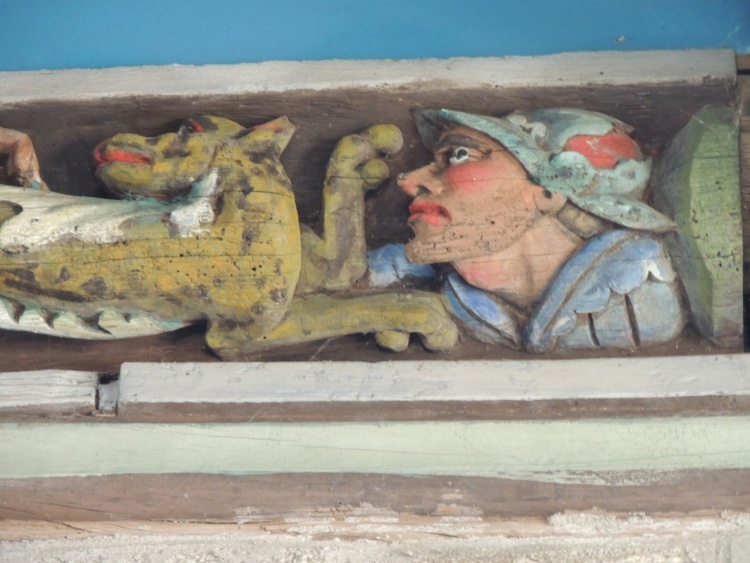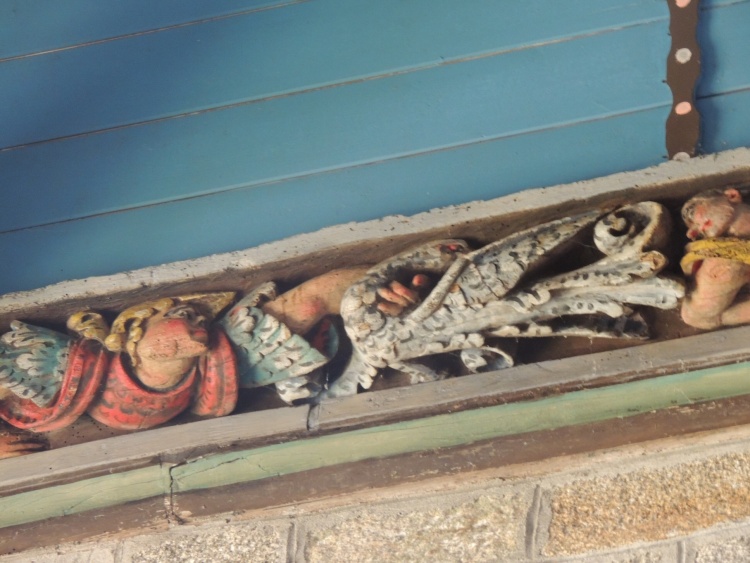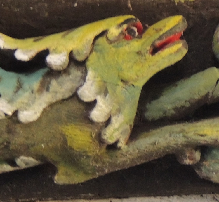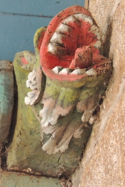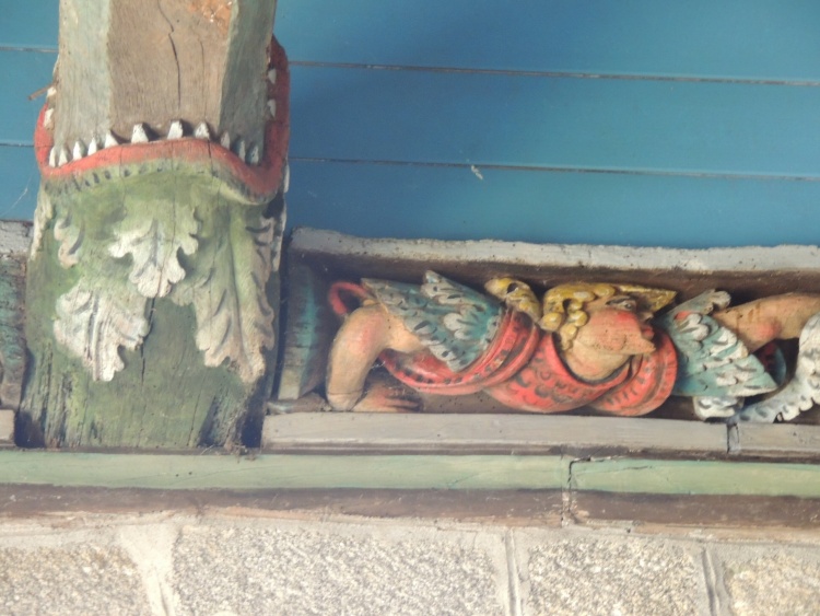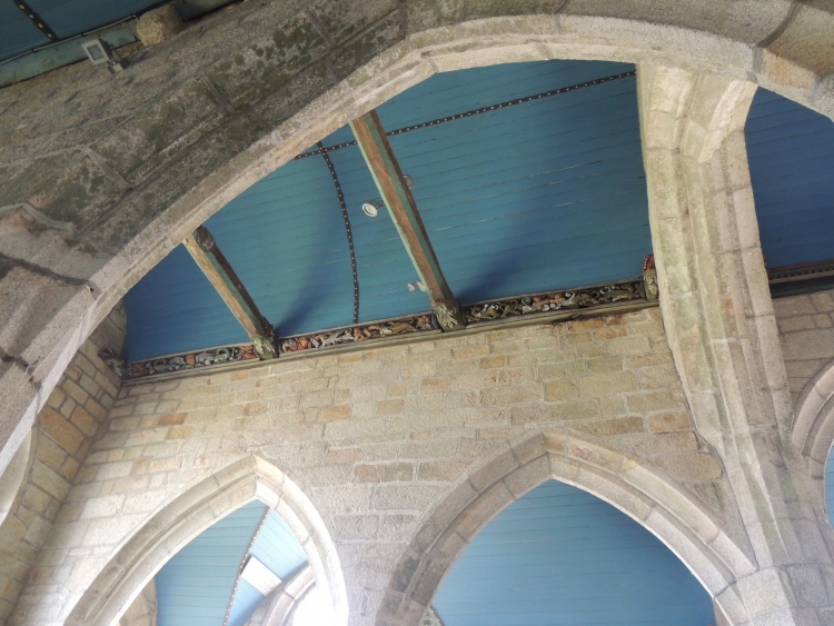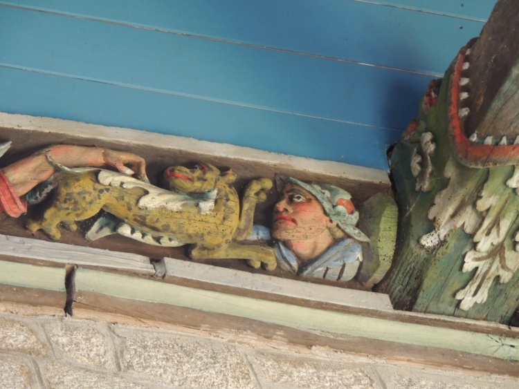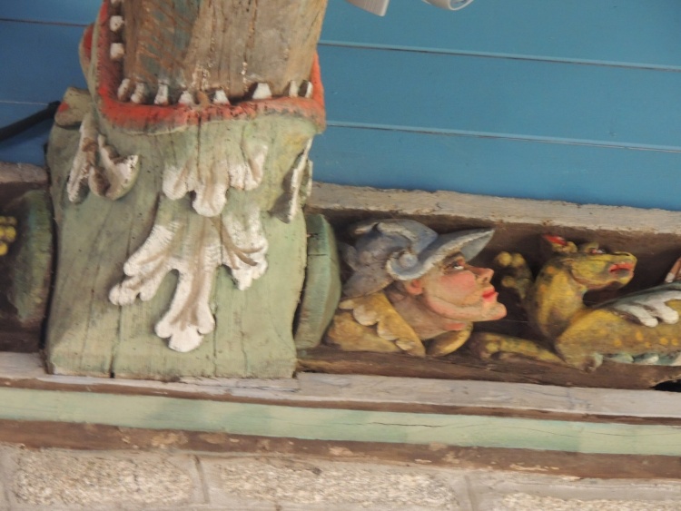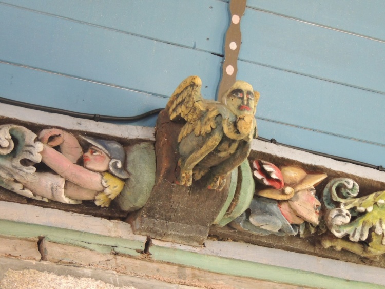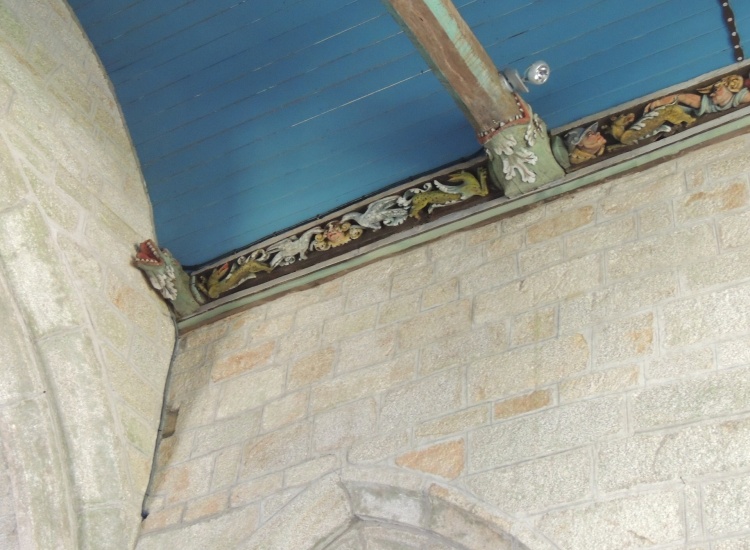 Pour apprécier la beauté des sablières Néanmoins, la beauté de l'ensemble est aujourd'hui encore remarquable. Les animaux sont diaboliques, aux corps de chiens allongés ou de dragons, ou alors des oiseaux aux ailes déployés. Comme dans une scène de l'enfer, certains engloutissent dans leur gueule les bras de figures humaines. Quant aux humains, leur allure générale fait penser à des soldats. Les chapeaux à plume de certains font penser à des mousquetaires ou des lansquenets A l'intersection de chaque entrait ou poutre transversale de la nef, il y a un engoulant |