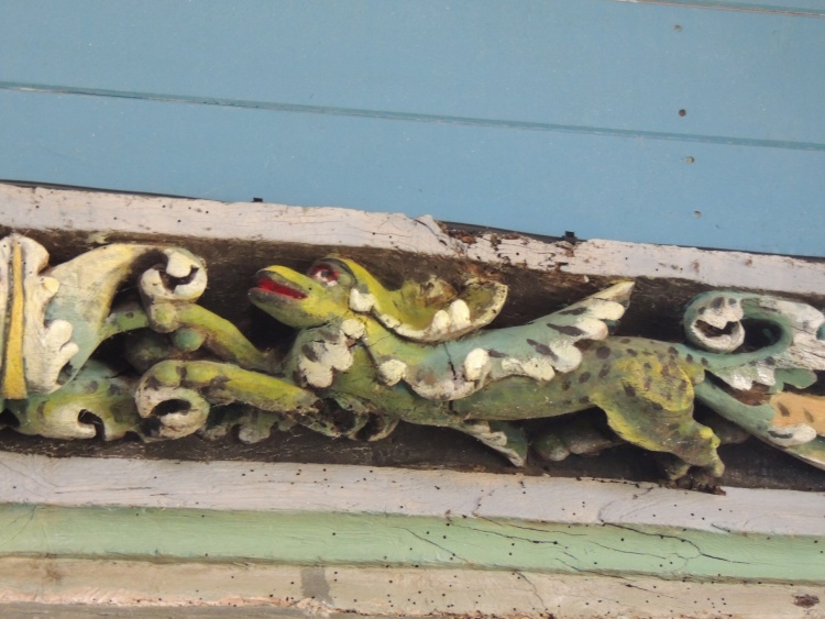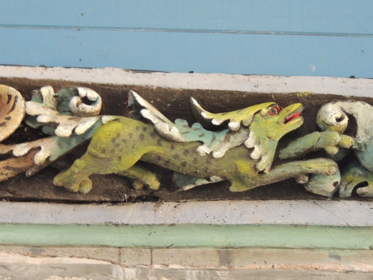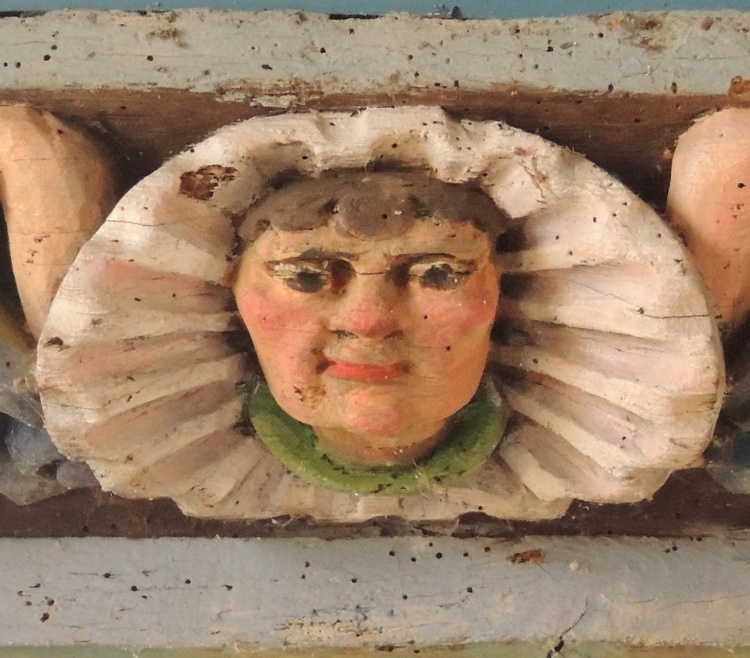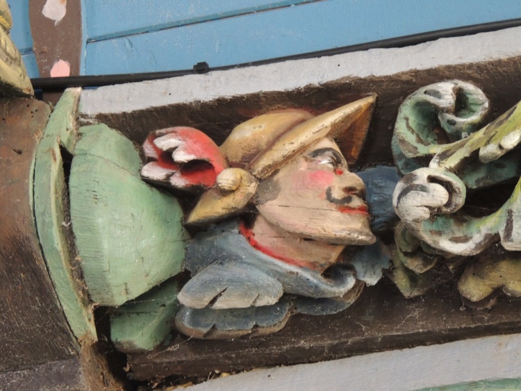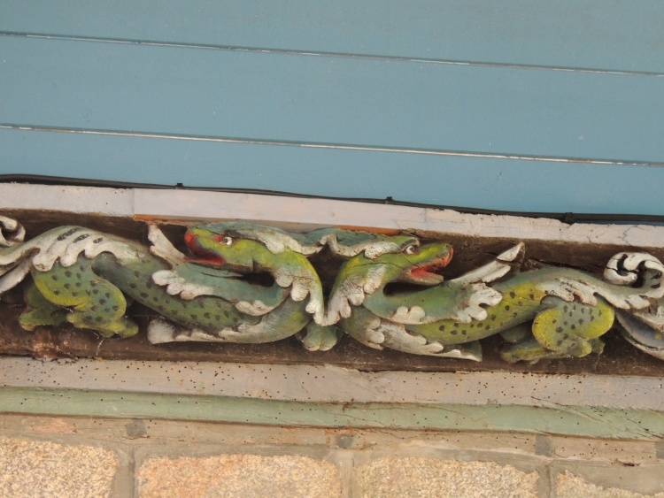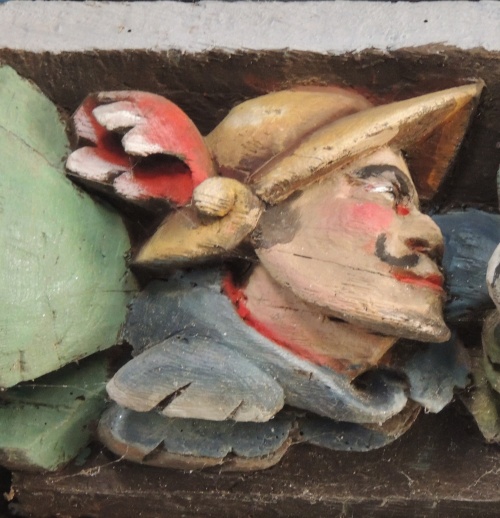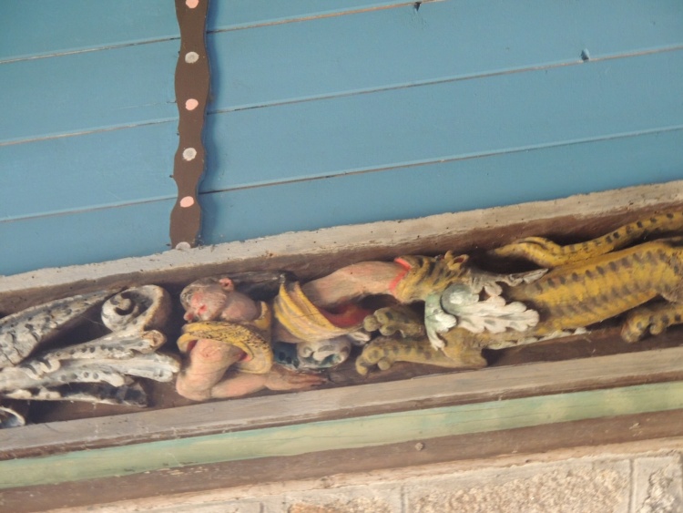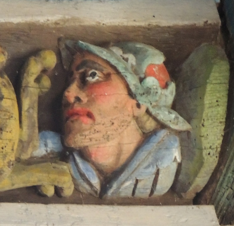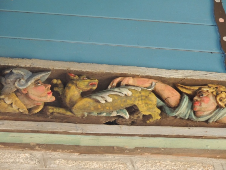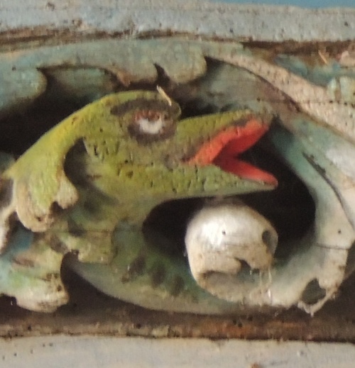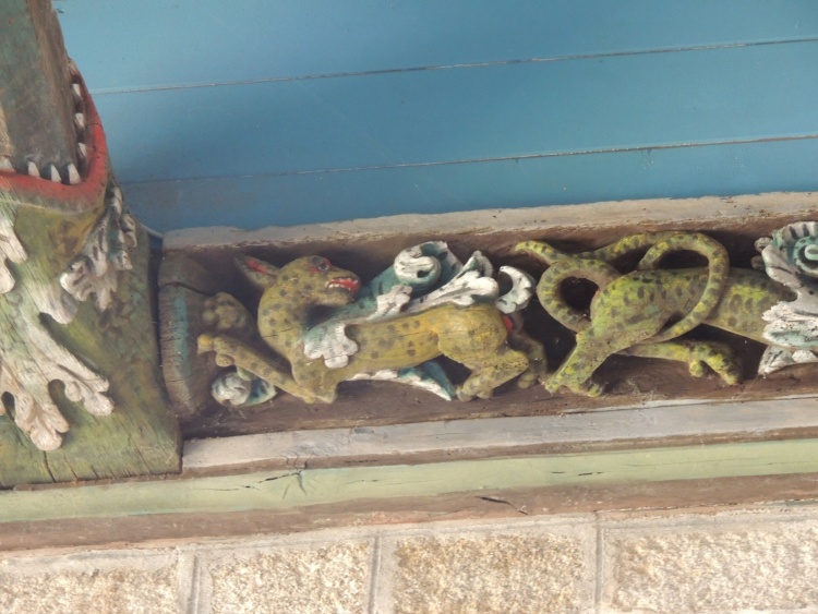 Pour apprécier la beauté des sablières Néanmoins, la beauté de l'ensemble est aujourd'hui encore remarquable. Les animaux sont diaboliques, aux corps de chiens allongés ou de dragons, ou alors des oiseaux aux ailes déployés. Comme dans une scène de l'enfer, certains engloutissent dans leur gueule les bras de figures humaines. Quant aux humains, leur allure générale fait penser à des soldats. Les chapeaux à plume de certains font penser à des mousquetaires ou des lansquenets A l'intersection de chaque entrait ou poutre transversale de la nef, il y a un engoulant |
