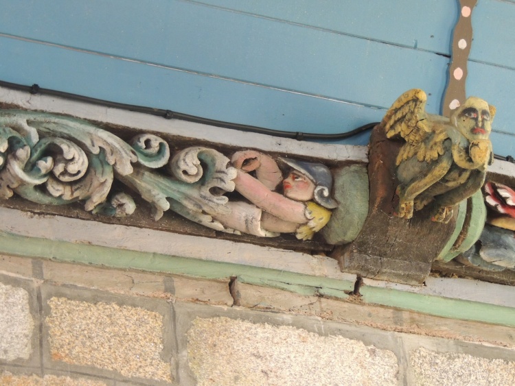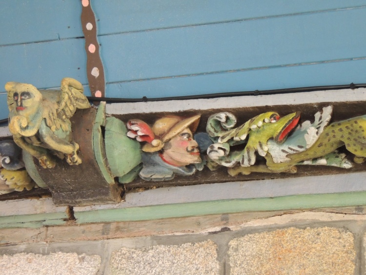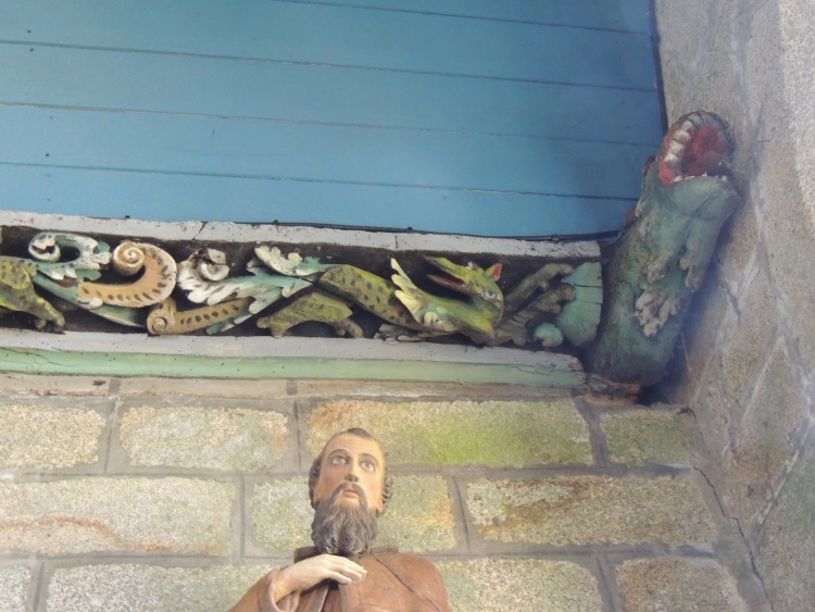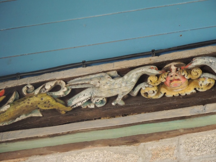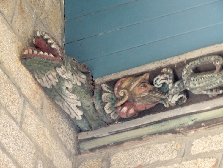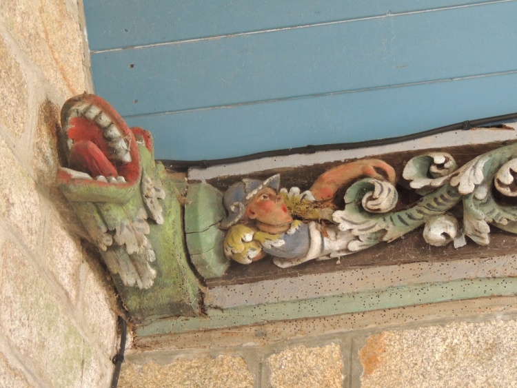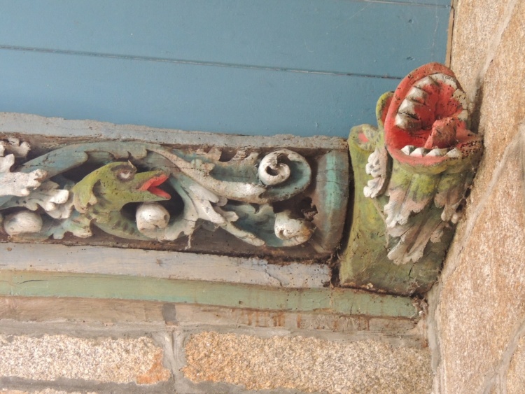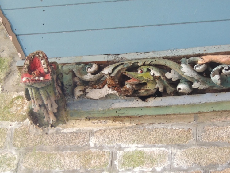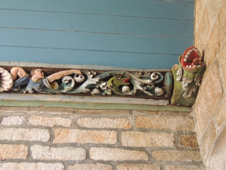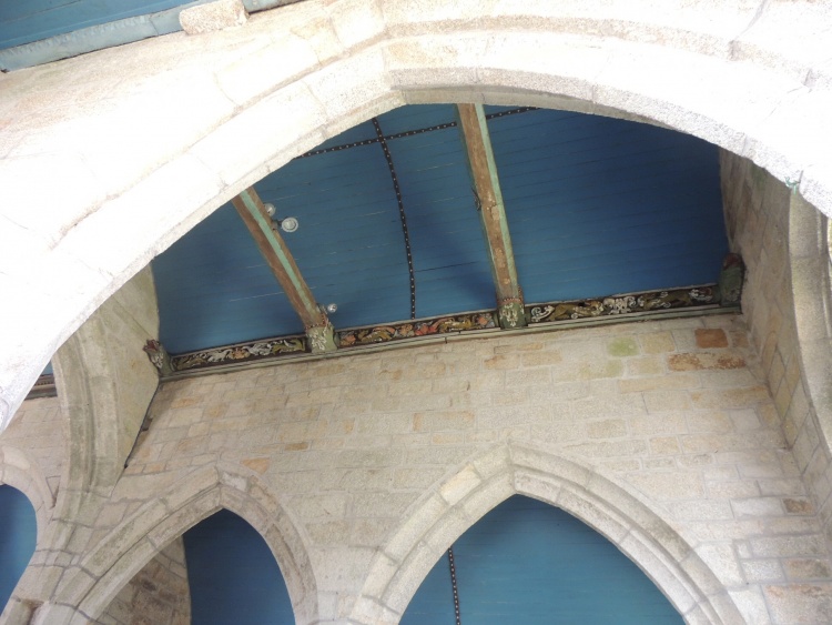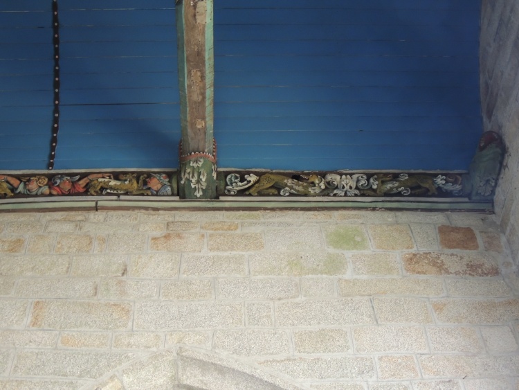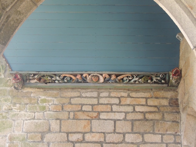 Quatre magnifiques sablières Les chanoines Paul Peyron et Jean-Marie Abgrall les décrivent ainsi : « Dans la partie est de la nef et des bas-cotés, sont des sablières sculptées avec beaucoup d'art, dans le genre de la Renaissance, présentant des animaux fantastiques agrémentées de feuillages et d'arabesques, puis des profils de soudards, lansquenets Autres lectures : « PEYRON et ABGRALL - Notices sur les paroisses de l´évêché de Quimper et de Léon » ¤ « Historique de la chapelle de Saint-Guénolé » ¤ « Laouic Saliou (1909,1990), sculpteur autodidacte » ¤ |