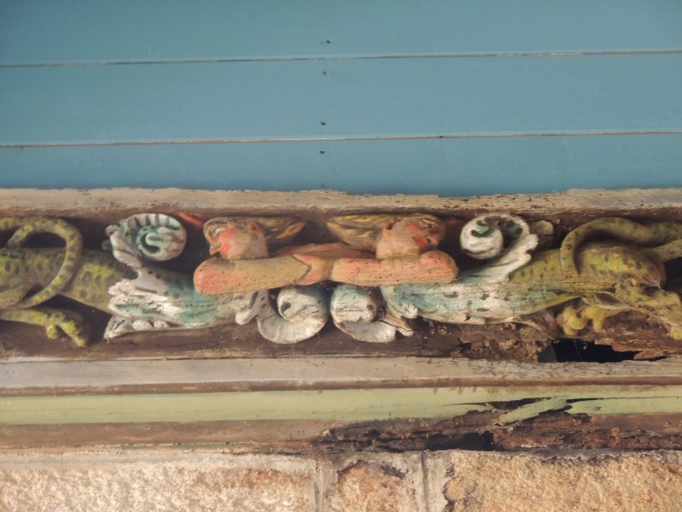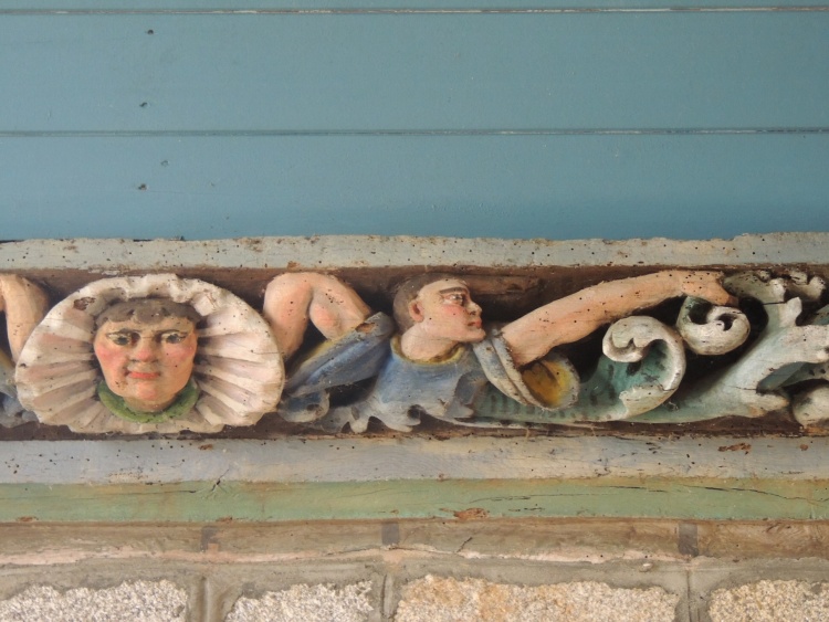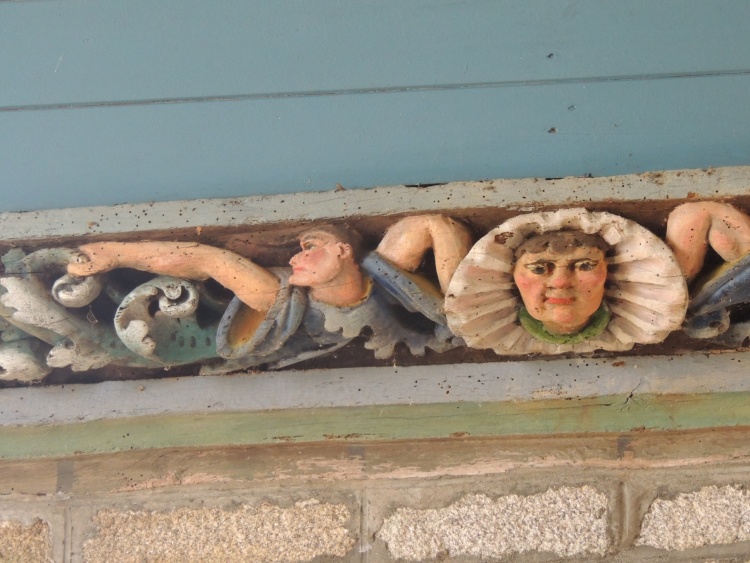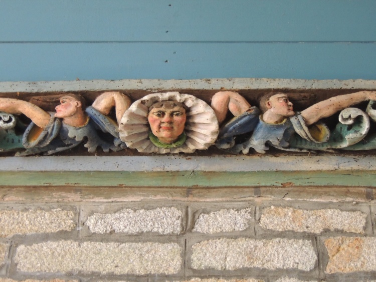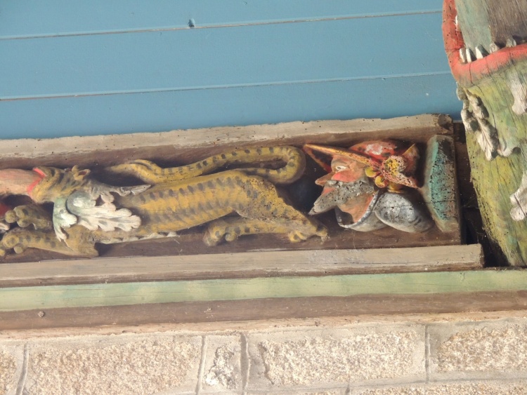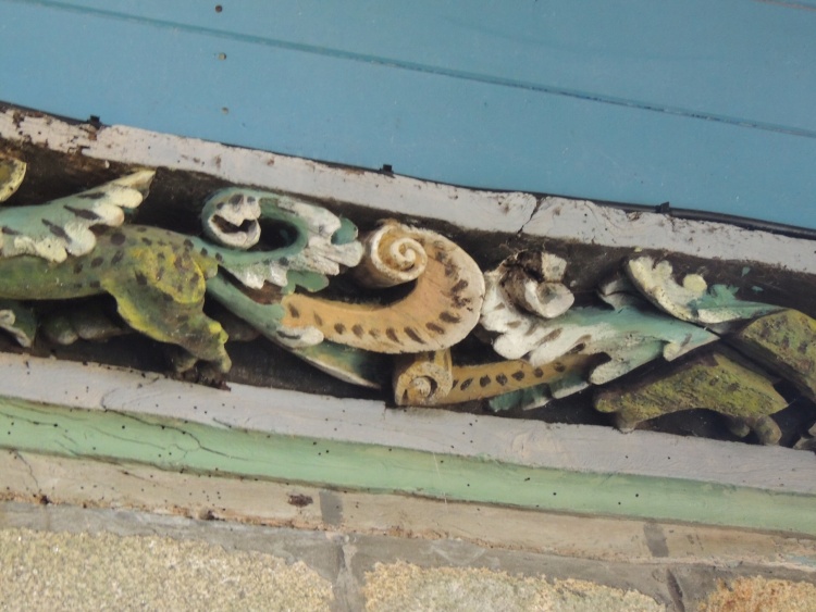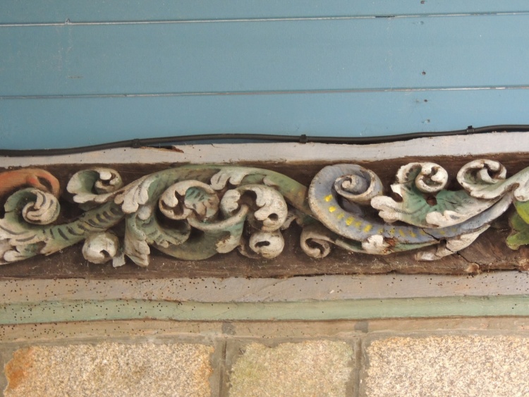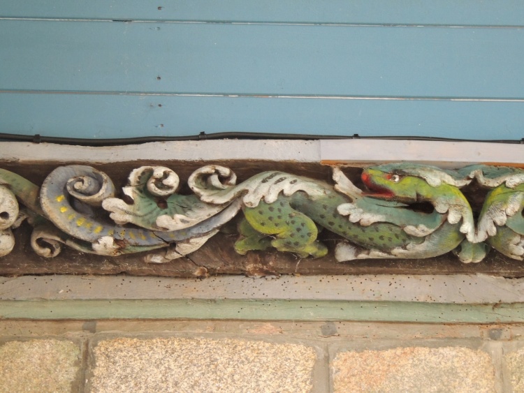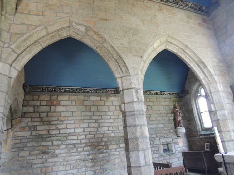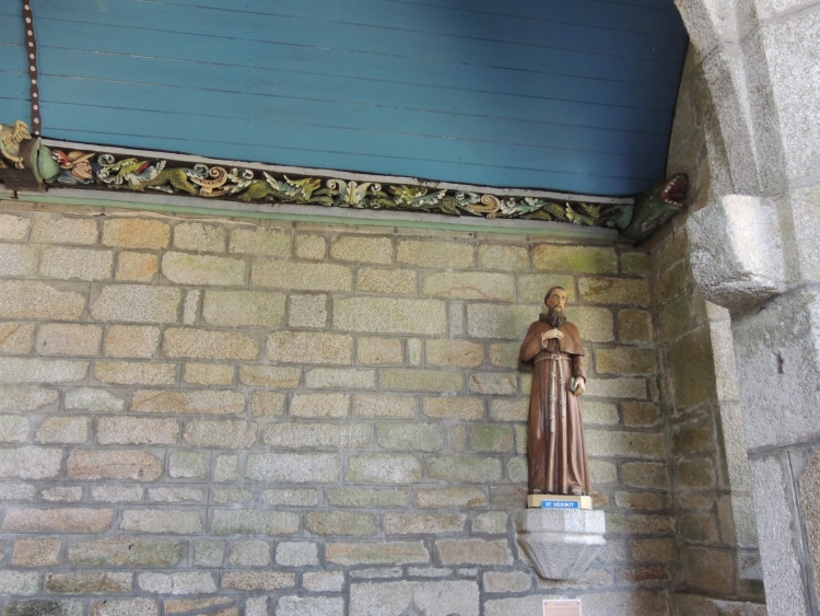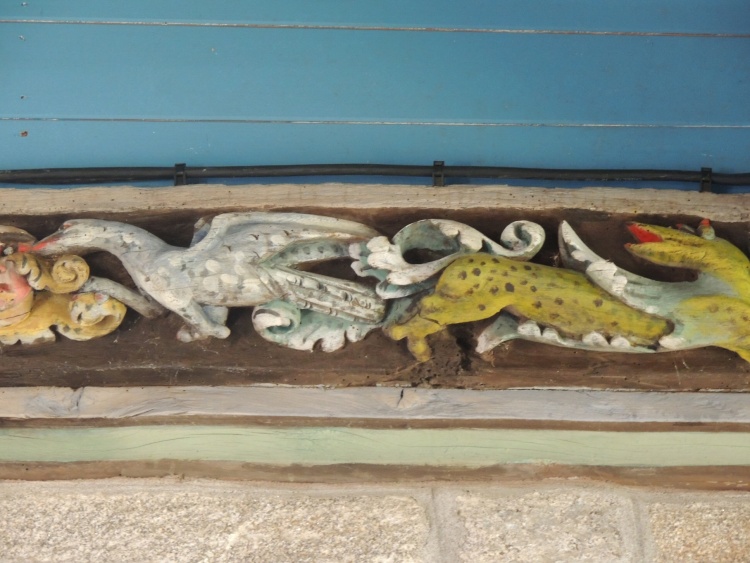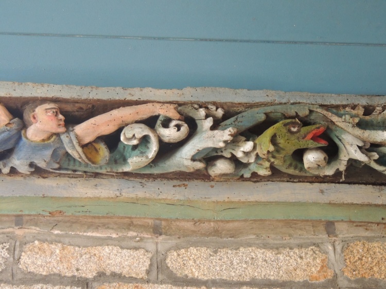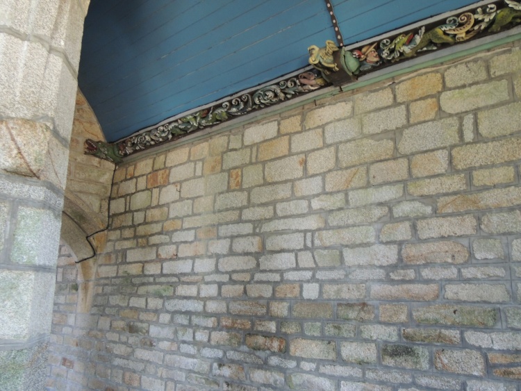 Quatre magnifiques sablières Les chanoines Paul Peyron et Jean-Marie Abgrall les décrivent ainsi : « Dans la partie est de la nef et des bas-cotés, sont des sablières sculptées avec beaucoup d'art, dans le genre de la Renaissance, présentant des animaux fantastiques agrémentées de feuillages et d'arabesques, puis des profils de soudards, lansquenets Autres lectures : « PEYRON et ABGRALL - Notices sur les paroisses de l´évêché de Quimper et de Léon » ¤ « Historique de la chapelle de Saint-Guénolé » ¤ « Laouic Saliou (1909,1990), sculpteur autodidacte » ¤ |