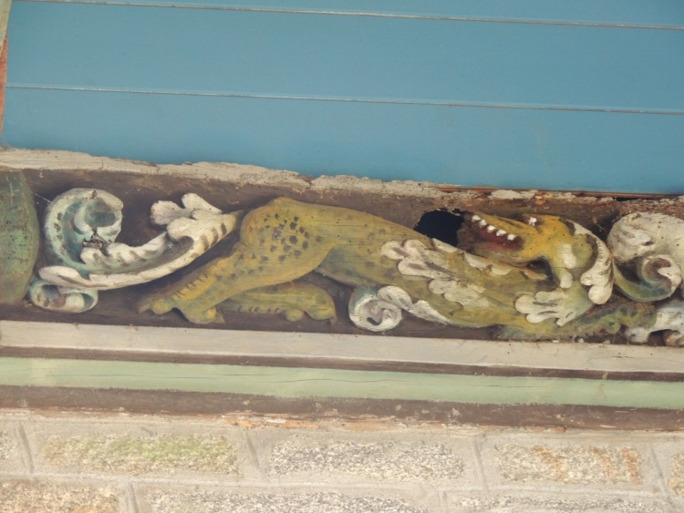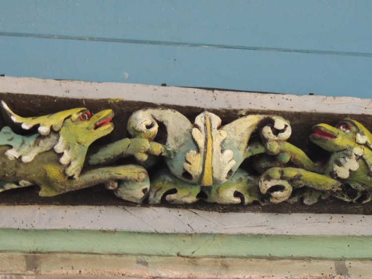 - Engoulant s.m : extrémité sculptée d’une poutre ou entrait, figurant une gueule animale avalant la poutre. L'engoulant est généralement présent aux deux extrémités. Source : wiktionary. [Terme] [Lexique] [Ref.↑]