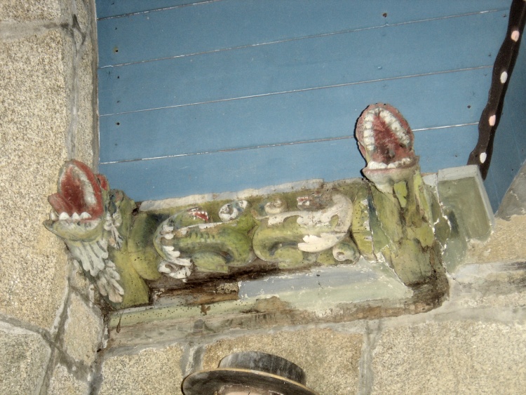 Pour apprécier la beauté des sablières En 1974 les boiseries et peintures ont déjà fait l'objet d'un entretien complet, sous le pinceau de l’Abbé Dilasser, membre de la Commission d’Art sacré. Un sculpteur local, Laouic Saliou, a aussi contribué à la rénovation de certaines pièces. Néanmoins, la beauté de l'ensemble est aujourd'hui encore remarquable. Les animaux sont diaboliques, des corps de chiens allongés ou de dragons, ou alors des oiseaux aux ailes déployées. Comme dans une scène de l'enfer, certains monstres engloutissent dans leur gueule les bras d'hommes. L'allure générale des humains fait penser à des soldats. Les chapeaux à plume de certains semblent indiquer des mousquetaires ou des lansquenets A l'intersection de chaque entrait ou poutre transversale de la nef, il y a un engoulant De quand datent les sablières ? Du 16e siècle lors de la fondation de la chapelle ? De 1679 à l'occasion de la rénovation du lambris ainsi que l'indique l'inscription au plafond du bas-côté sud : « Faict par Laurens Balbous et Yvon Iaovhen 1679 » ? Ou alors bien plus tard, voire même au 19e siècle avec une inspiration de style Renaissance, lors de travaux ultérieurs ? On remarquera aussi un blason central sur une poutre joignant les sablières de la nef. Ce blason, en très mauvais état, est écartelé en 2 partis : « 1° d’azur à la croix patriarcale