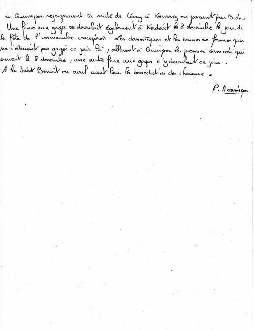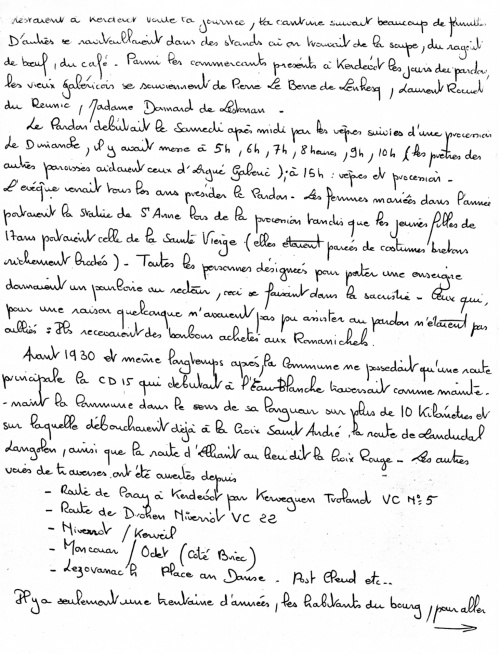 Un article manuscrit, inédit, rédigé en 1980, mais non publié, par le fabricien Pierre Roumegou, sur les coutumes du pardon de Kerdévot au début du 20e siècle.