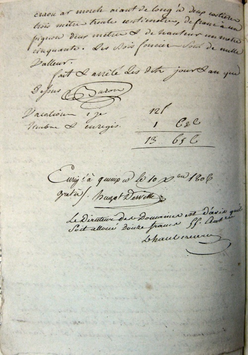 de revenu 2 hectolitres (3 combles [7]) froment, 3 hectolitres 68 litres (5 combles [7] et demi) seigle, 4 hectolitres 8 litres (5 boisseaux combles [7]) avoine, un chapon [8] et cinq francs quatre vingt cinq centimes.