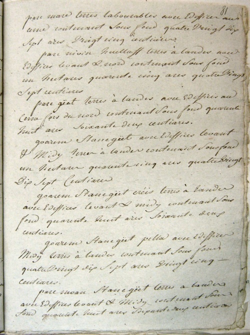 En sept hectares soixante dix sept ares quatre vingt quatorze centiares terres labourables : 16 journaux [12] et demi.