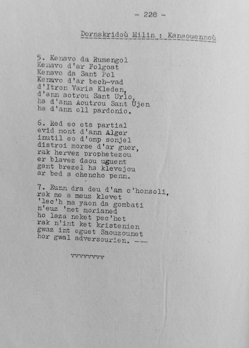 5. Adieu à Rumengol, adieu au Folgoet, adieu à Saint-Paul, adieu au Bon-Voyage. à Notre-Dame de la Clarté, à vénéré saint Urlou, et à vénéré Saint-Ygeaux, et à tous les pardons.