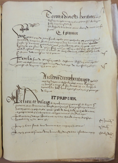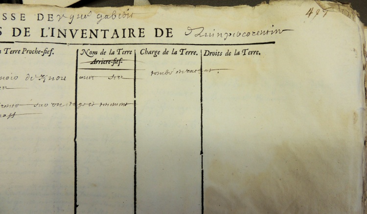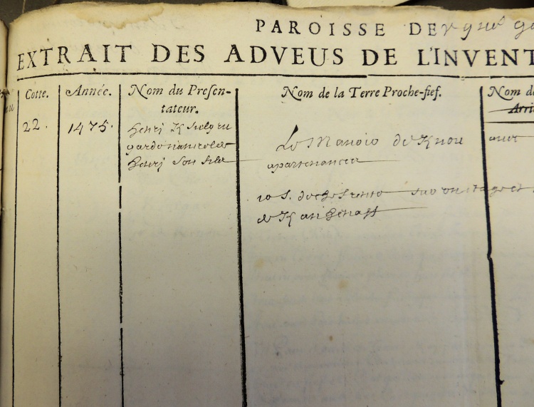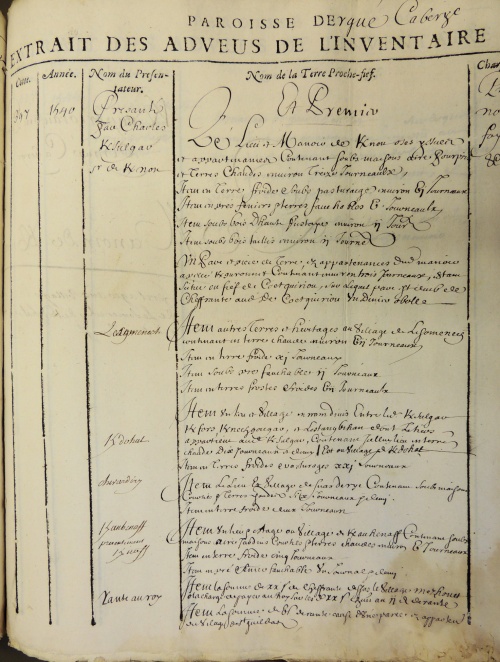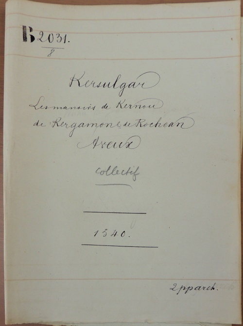 On trouvera ci-dessous une tentative de transcription du document original de 1540, avec en regard ce qui a été retenu et résumé dans le registre d'inventaire A85 plus tardif. Le manoir est décrit "ET PREMIER" en première des 8 pages : « où demeure le sieur Kersulgar en la dite paroisse d'Ergue Caberic, contenant soubz maisons, ayre, pourpris et terres chaudes envyron treize journaux ». Les villages et terres constituant le domaine noble de Kernaou sont dans l'ordre Coat Piriou (Quoet Quiriou), Lezouanac'h (Lesonmenech), Kerdohal, Chevardiry, Kernéno-Kerdilès (Keranhenaff), Meouet (Mezhouet) et également quelques terres à Briec et à Chateaulin. Au 17e siècle le domaine de Kernaou tombera par succession maritale dans l'escarcelle des familles nobles voisines de Kerfors et Lezergué, à savoir les Autret et de La Marche. |