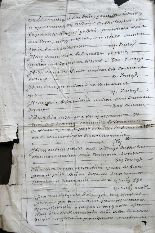 - Journal, s.m. : ancienne mesure de superficie de terre, en usage encore dans certains départements et représentant ce qu'un attelage peut labourer dans une journée. Le journal est la principale unité de mesure utilisée dans les inventaires pour calculer les surfaces des champs cultivés. Dans la région quimpéroise un journal vaut 48,624 ares, à savoir 80 cordes, soit environ un demi-hectare. Pour les jardins et les courtils on utilise le terme de « journée à homme bêcheur » correspondant à un 8e de journal ou 6 ares. Les surfaces des prés se mesurent en « journée à faucheur » ou « à faucher » équivalente à 2 journaux de laboureur, soit presque un hectare. [Terme] [Lexique] [Ref.↑ 10,0 10,1 10,2 10,3 10,4 10,5]