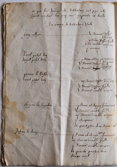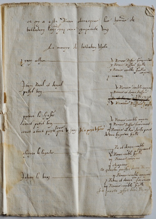 Le rentier de Botbodern de 1550-51 ne comprend que les paiements des mouvances majuscules, à savoir 7 villages elliantais (Kerancorre, Mesfal, Kerdanyc, Keradenen, Kerlenyc, Kerongar, Kerlangnez), et « Kerdyllès » en Ergué-Gabéric. Le titre de 1551 est « ce quy a esté percu davecques les homes de Botbadern l'an mil cynq cent cinquante ung », et celui de 1552 « ce que les homes de Botbadarn ont payé à la seynct Mychel lan myl cinq cent cynquante et deulx ». Tous les paiements annuels sont en nature, soit en animaux (1 ou 2 chapons, à savoir des jeunes coqs châtrés, ou un mouton), soit en céréales (froment, orthographié « fourmant », avoine, seigle et mil). Cette dernière céréale, appelé aussi millet en Afrique, aux grains ronds et jaunâtres, est cultivée localement et apprécié en laitage. Au village de Kerdilès, les fermiers débiteurs de Botbodern sont au nombre de 8, dont le principal est Allayn Connan. En 1551 il doit « 4 renées fourmant - 8 renées seglle - 2 renées myl pour deux ans - 6 renées avoyne - 2 chapons ».