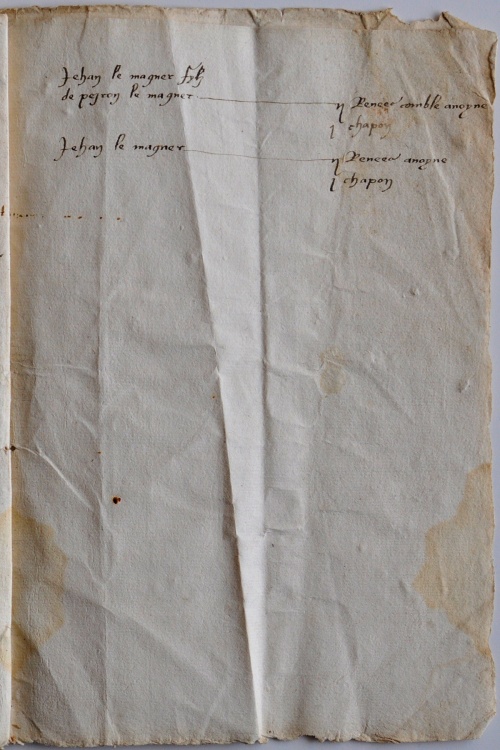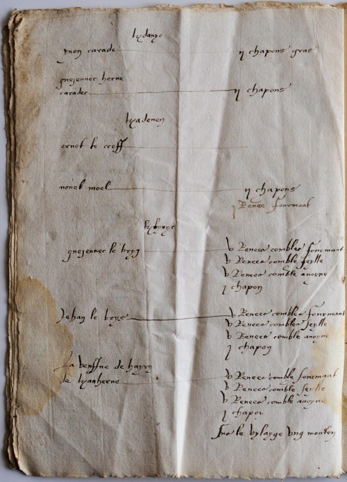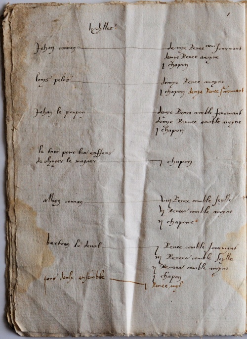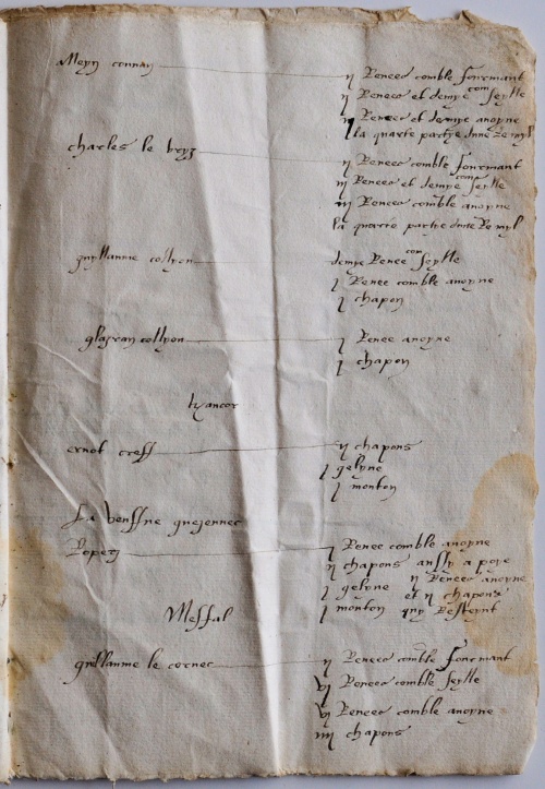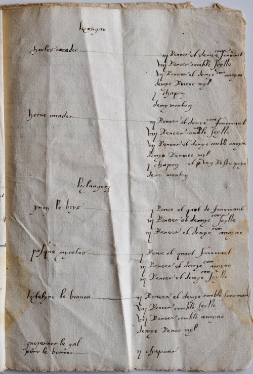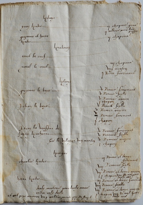Le document est très bien conservé et l'écriture est élégante, mais néanmoins, du fait de son ancienneté, il n'est pas facile à décrypter, ce qui peut expliquer certaines transcriptions lacunaires pour l'instant. C'est l'occasion de pratiquer un peu de paléographie, notamment le déchiffrage des chiffres romains minuscules tels qu'ils étaient calligraphiés au 16e siècle (cf Image:ChiffresRomains16e.jpg). Merci à Loïc Le Roy de Kerderrien de nous avoir communiqué ce document issu du fonds d'archives privées de Louise De Guengat. Autres lectures : « BERNARD Norbert - Chemins du Ve au XVIIe siècle à Ergué-Gabéric » ¤ « 1536 - Réformation des personnes et des terres en Ergué-Gabéric » ¤ « Kerdilès, Kerdillez » ¤ « Géo.Kerdilès » ¤ |