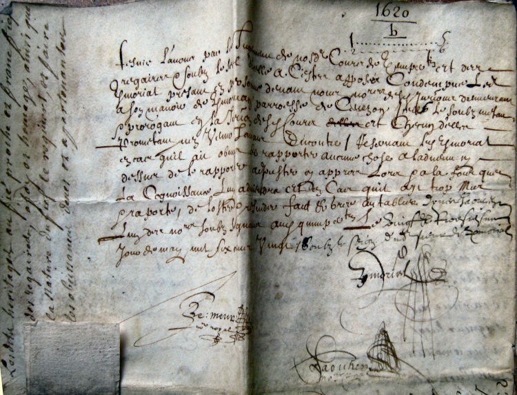 (...) Cour de Quimper et des Regaires [15] soubz (...) par Louys Kermorial presant et (...) à son manoir se Kermorvan paroisse de Cuezon, (...) Luy Kermorial (...) la cognoissance (...) jour de may mil six cents vingt. Soubz le seign dudit (...) Kermorial.