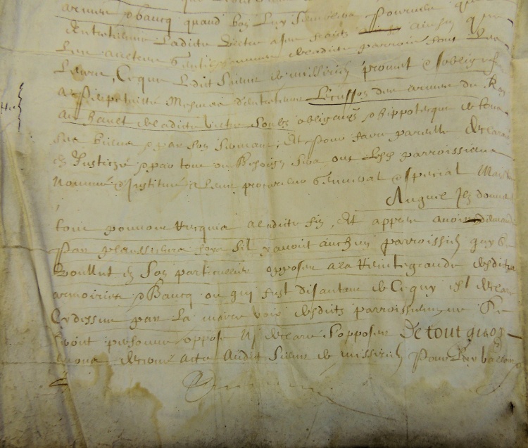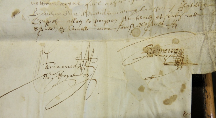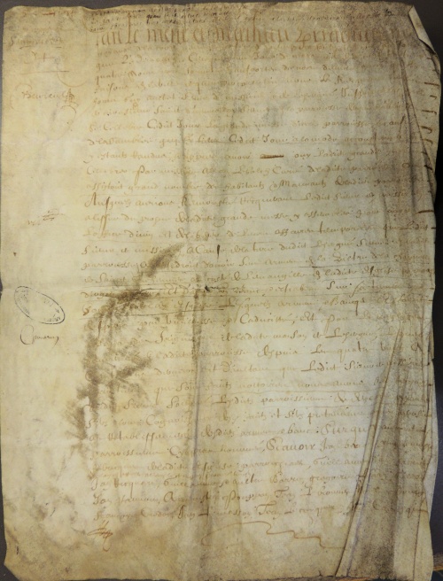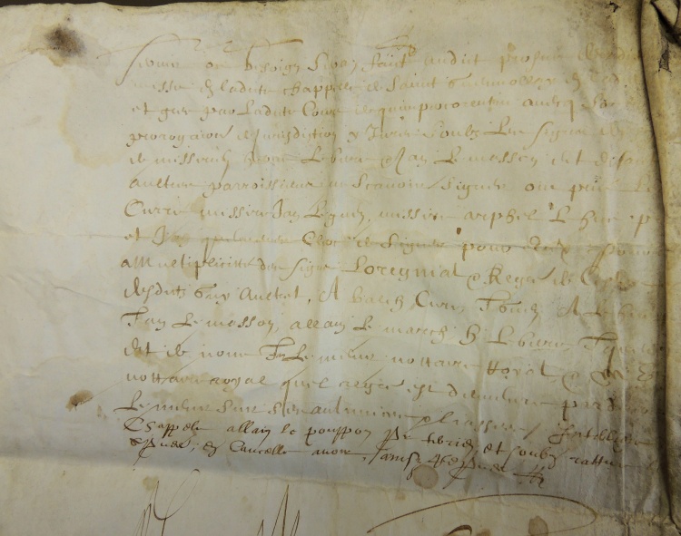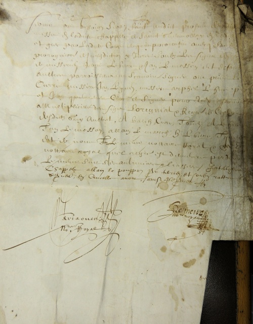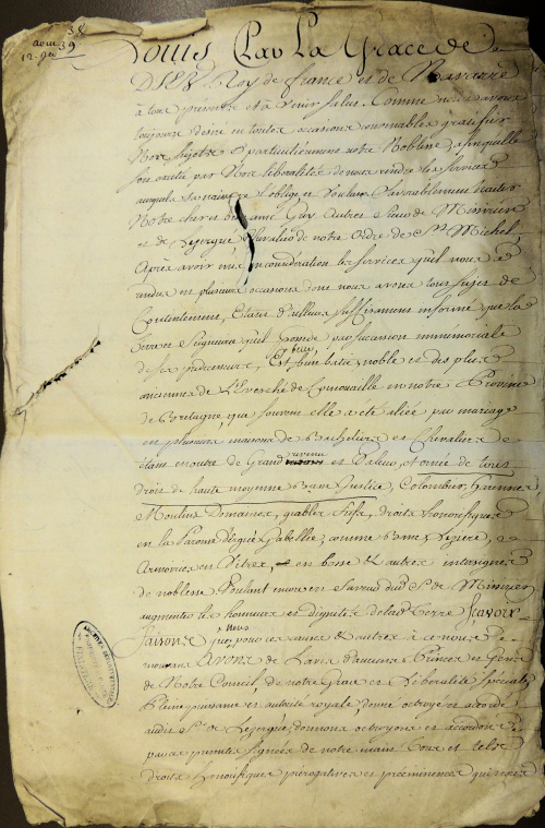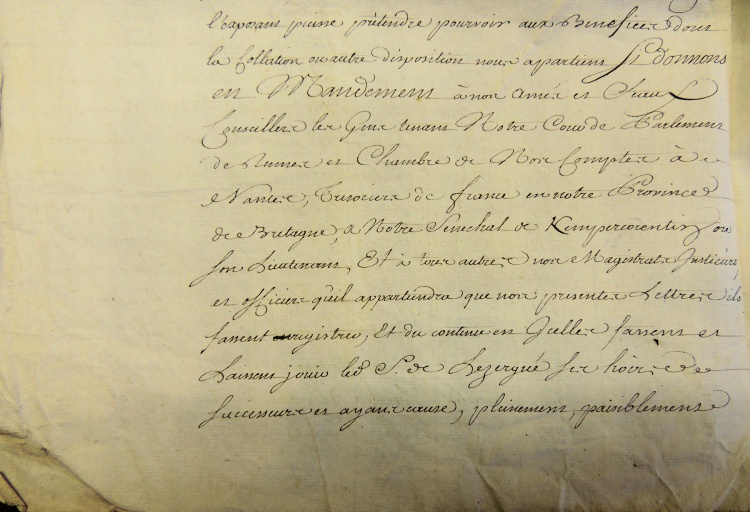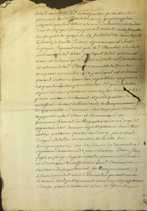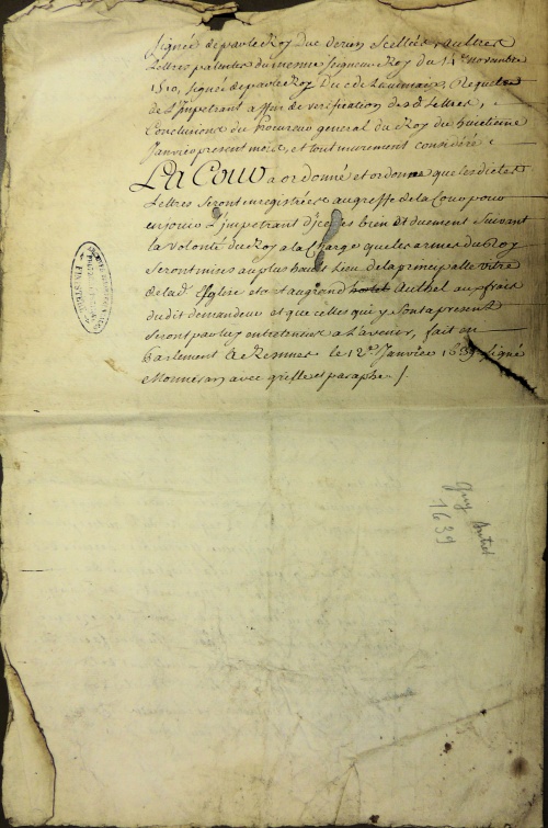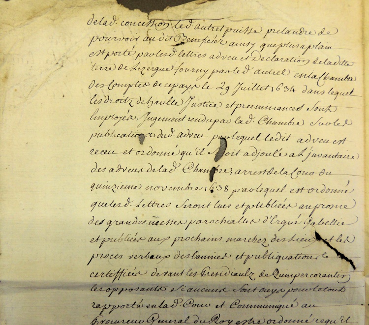 Le premier document, daté du 5 mars 1634 et qualifié d'acte prônal À « la dicte grande messe célébrée par messire Allain Le Balch curé de la dicte parroisse assistoit grand nombre des habitants » et pas moins de 45 paroissiens mettent leur noms pour autoriser les armoiries locales à la chapelle de St-Guénolé et « remettre les armes et bancq Les deuxième et troisième documents sont constitués des lettres patentes royales reçues en août 1638 et de leur mise en exécution par le Parlement de Bretagne le 12 janvier 1639. La lisibilité est facilitée car ce ne sont pas des originaux, mais des copies ultérieures du 18e ou 19e siècle et conservées aux Archives Départementales du Finistère. Dans ses lettres patentes commençant par un tonitruant « Louis par la grace de Dieu Roy de France et de Navarre à tous présents et à venir salut », le roi Louis XIII formule lui-même ses intentions : « voulant favorablement traiter notre cher et bien aimé Guy Autret sieur de Missirien et de Lezergué, chevalier de notre ordre de St Michel », « suffisamment informé que la terre seigneurie qu'il possède par succession immémoriale de ses prédécesseurs, est belle et bien bâtie, noble et des plus anciennes de l'Evesché de Cornouaille en notre province de Bretagne », « ornée de tous droits de haute moyenne et basse justice, colombier, garennes, moulins, domaines, ... intersignes de noblesse. Voulant encore en faveur dudit sieur de Missirien augmenter les honneurs et dignités de la terre ». La décision royale est très généreuse : « donnons octroyons et accordons de par ces présentes signées de notre main tous et tels droits honorifiques et prérogatives et prééminences qui nous appartiennent en l'église paroissiale d'Ergué Gabellie, et en la chapelle de St Guénolé situé en la même paroisse hors l'église paroissiale, avec tout pouvoir de faire mettre ses armoiries, blasons et enseignes de noblesse au dedans et au dehors des dites église et chapelle au lieu plus éminent, tant en vitres, lisières qu'en bosse, en tous endroits que bon lui semblera ». La formule finale consacrée « Car tel est notre plaisir » conclut la lettre royale, suivi de la mention « Par le roy » et du nom et signature du surintendant des finances, à savoir Claude Bouthillier [4], outre qu'elle est préparée par le Conseil du roi et contresignée par un secrétaire d'état, doit être scellée de cire verte du grand sceau royal et faire ensuite l'objet d'un décret d'exécution. Dans l'extrait de registre d'exécution par le Parlement de Rennes en janvier 1639, on note bien la description précise du sceau apposé sur les lettre d'août 1638 : « un grand sceau de cire verde à laqs de soye rouge et verde ». Les « laqs » sont les lacets colorés qui attachent le sceau au bas du parchemin.