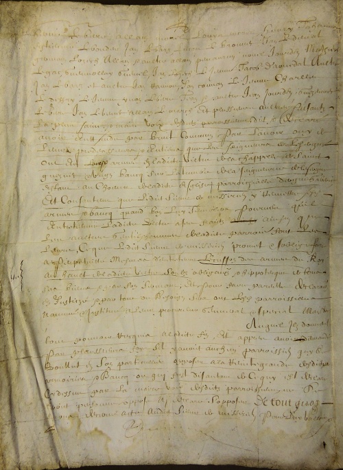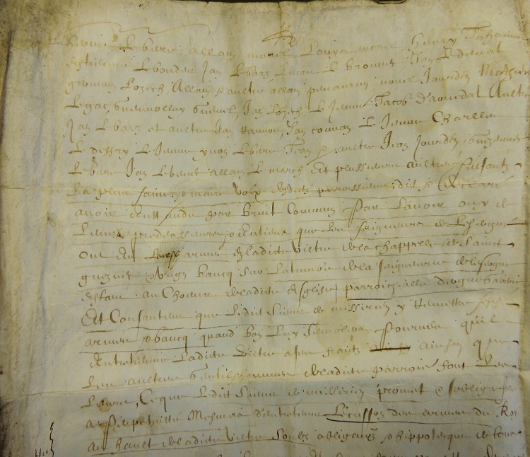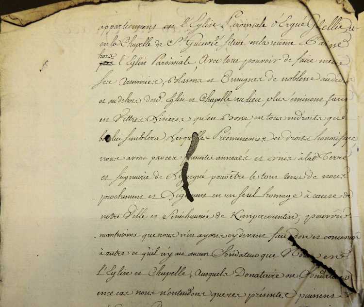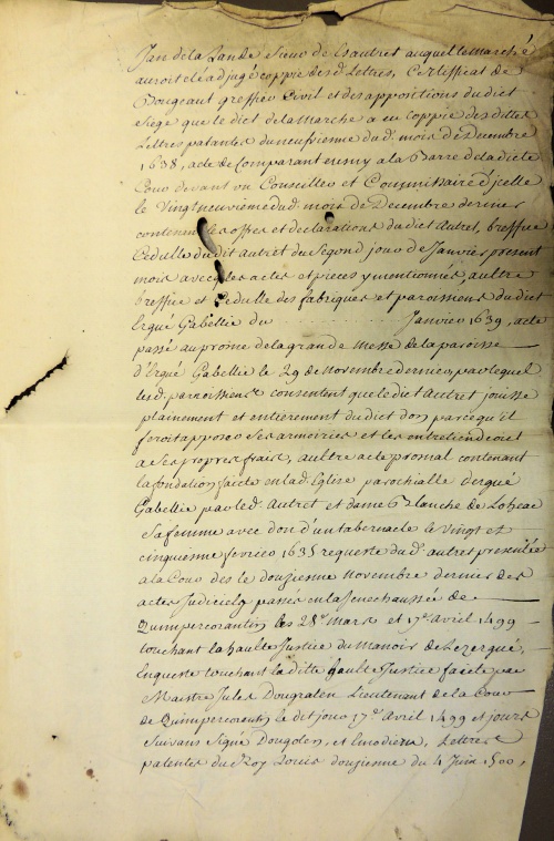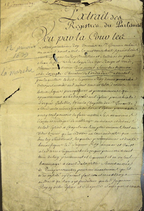| Un acte prônal de 1634 attestant l'accord collégial des paroissiens, des lettres patentes personnalisées du roi Louis XIII en 1638 et un extrait récapitulatif du registre du Parlement de Bretagne en 1639, le tout pour confirmer les droits de prééminences du sieur Guy Autret en l'église paroissiale et chapelle de Saint-Guénolé.