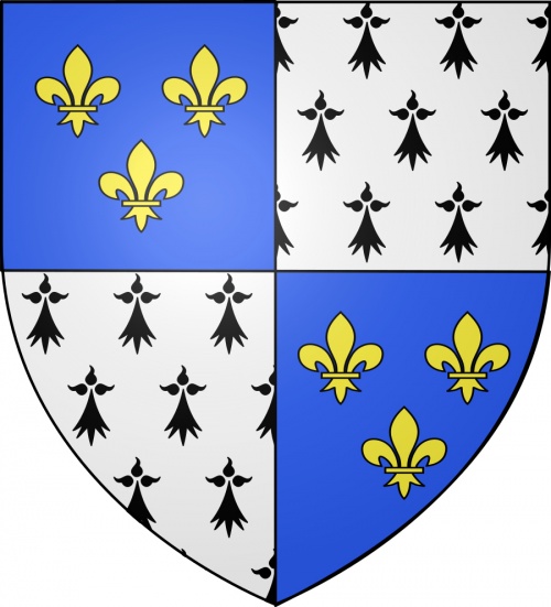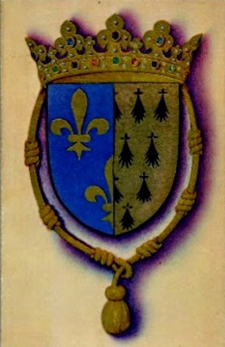 Par contre, au 2e rang on voit à gauche deux blasons surmontés de vraies couronnes ducales au motif feuillu, sans collier de Saint-Michel. A gauche les armes, en mi-parti des fleurs de lys et des hermines, sont celles de la duchesse Anne de Bretagne (1477-1514), mère de Claude de France, et à droite il s'agit du blason historique « D'hermine plain » du duché.
