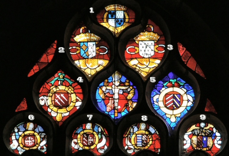 Tous les blasons des Autret (10 bandes d'argent et azur) et de leurs prédécesseurs de Lezergué (croix potencée) et Coatanezre (trois épées), ont bien été mis dans le tympan de la maitresse-vitre de l'église paroissiale, entourés du collier jaune de l'ordre de Saint-Michel dont Guy Autret était chevalier. Sur le tout dernier blason Coatanezre qui est resté dans son état d'origine, on distingue même nettement la coquille dite de Saint-Jacques sur le collier. La décision royale d'octroyer à Guy Autret les prérogatives appartenant à la couronne est conditionnée par le fait « que les armes du Roy seront mises au plus hault lieu de la principalle vitre de la dite église étant au grand authel aux frais du dit demandeur ». Nous aurions donc du y trouver le motif armorial des trois fleurs de lys surmontées d'une couronne royale, faite également de fleurs de lys. Or le motif supérieur de la couronne n'est pas très net et le blason est écartelé en 4 parties, en 1 et 4 des fleurs de lys (remplacés par 3 morceaux noircis de vitrail), et en 2 et 3 par des hermines : ces armes sont celles de Claude de France (1499-1524), reine et épouse de François 1er. Et par ailleurs le blason est bien entouré du collier de l'ordre royal de chevalerie de Saint-Michel. |