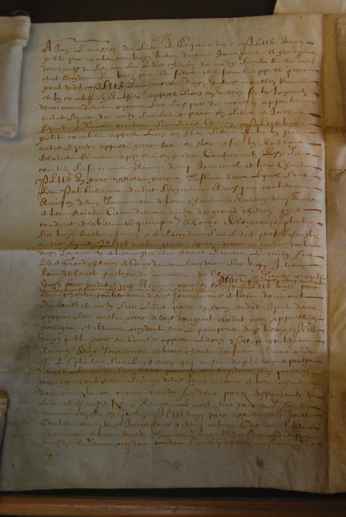 Cheffrente au seigneur Eveque de Quimper, moitié de soixante sols monöye[2], moitié d'une geline[3], moitié d'une carnée[4]froment, et d'un demi comble[5]avoine. Les héritages [...] de feu Guillou [... ]