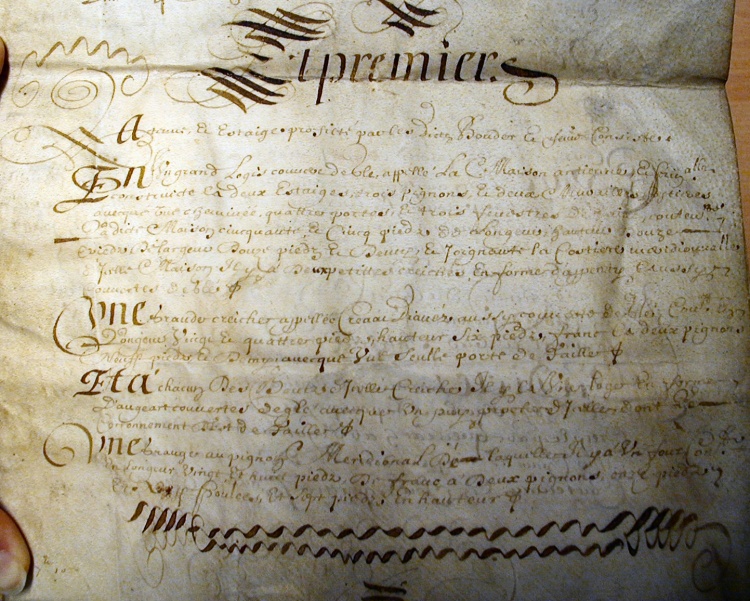 En un grand logis couvert de gle [6], appellé la maison antienne et principalle, construite à deux estaiges, trois pignons et deux murailles costières, avecque une cheminée, quattre portes et trois fenestres de taille. Contenante, la dicte maison, cincquante et cincq piedz de longueur ; hauteur, douze piedz ; de largeur, douze piedz et demy ; et joignante la costière médiodionnalle d’icelle maison, il y a deux petittes creiches en forme d’appenty, aussy couvertes de glé [6].