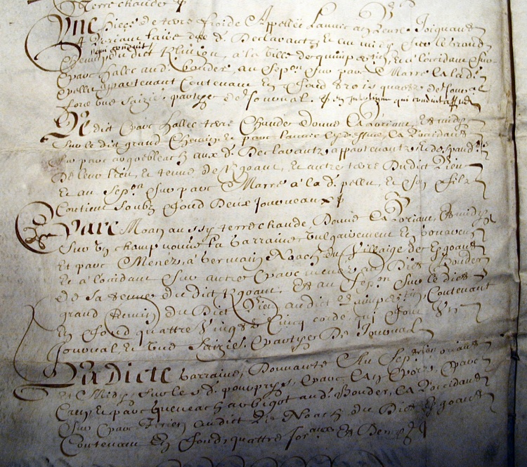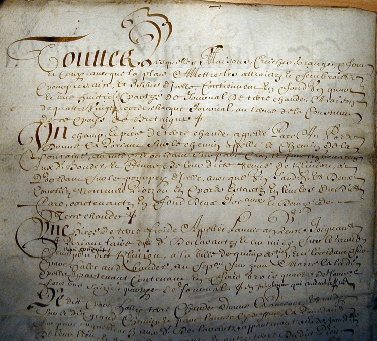 Touttes lesquelles maisons, creiches, grange, four et puy, avecque la place à mettre les attroictz et fembroictz [7], pourpri [8], aire [9] et issue d’icelle, contiennent, en fond, un quart et huictiesme partye de journal [10] de terre chaude [11], à raison de quattre vingtz corde [12] chaque journal [10], au terme de la coustume de ce pays de Bretaigne.