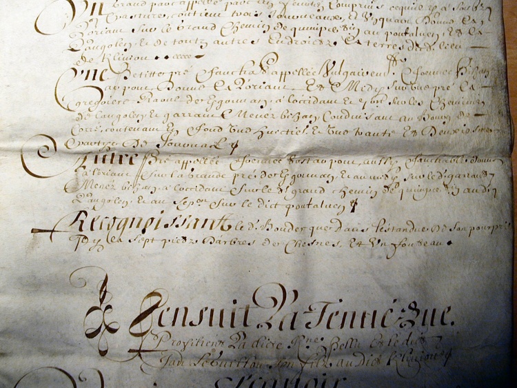 Un grand fennier fauchable, nommé Foennec Guillou, donnant, à l’oriant et midy, sur terres de Kersaux et, à l’occidant, sur le Grand Chemin du dict Quimpercorentin au dict Pontalven et, au septentrion, sur une pré à pasture au dict Grégoiere Raoul, de Kergonnan. Contenant, en fond, deux journeaux [10] et un quart.