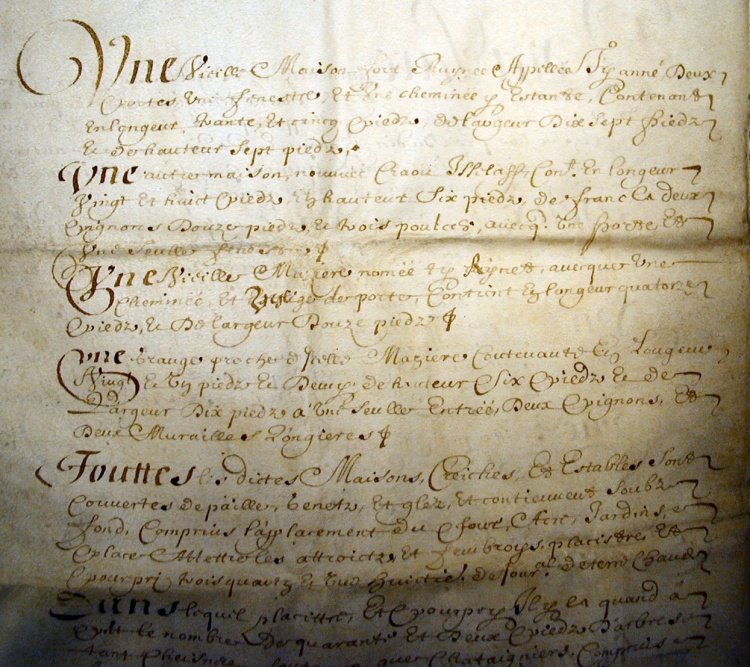 Touttes les dictes maisons, creiches et estables, sont couvertes de paille, genetz et glez, et contiennent, soubz fond, comprins l’applacement du four, aire, jardins, place à mettre les attroictz et fembroys [7], placistres et pourpri [8], trois quartz et une huictiesme de journal [10] de terre chaude [11].