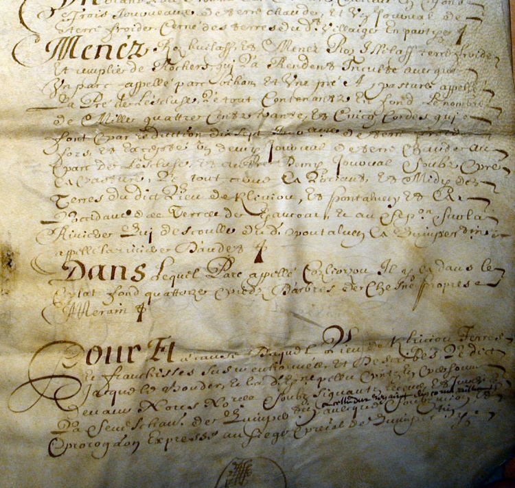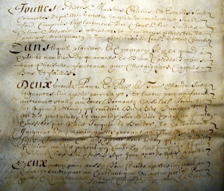 Dans lequel placittre et pourpry [8], il y a, quand à présent, le nombre de quarante et deux piedz d’arbres, tant cheisne, fouteaux que chataigniers, compris bons et faillis.