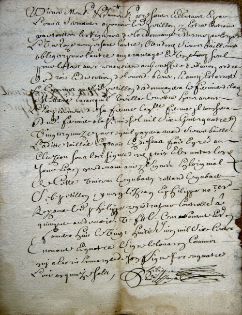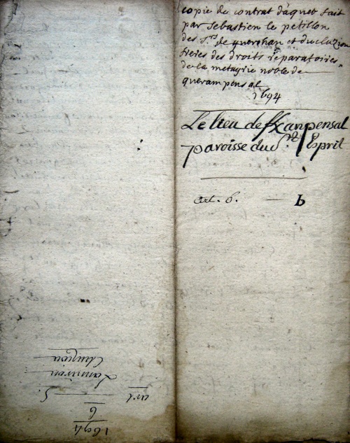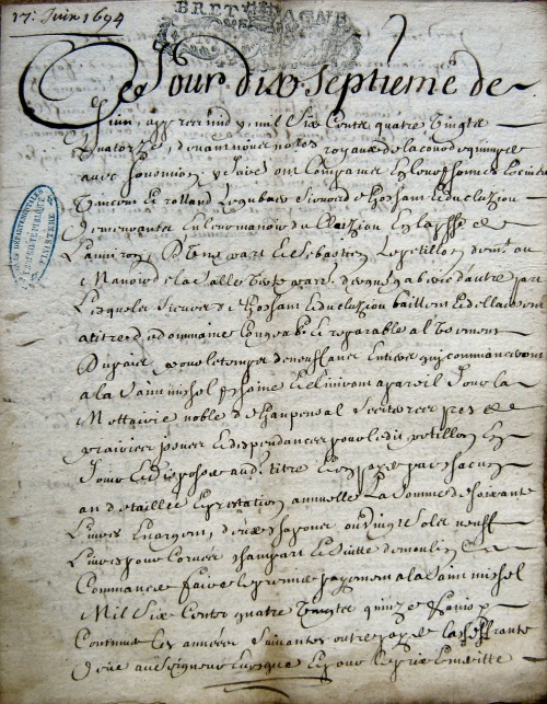 Ce jour dix septième de juin, apprès midy, mil six cents quatre vingts quatorze, devant nous notaires royaux de la cour de Quimper (...) ont comparu en leurs personnes avec soumission y jurée Vincent et Rolland Legubaer sieurs de Kerossam et du Cluziou demeurants en leur manoir du Cluziou en la paroisse de Lanniron d'une part, et Sébastien Lepetillon demeurant au Manoir de la Salle verte en la paroisse d'Ergué gaberic d'autre part, lesquels sieurs de Gossam et du Cluziou bailleurs (...) à titre de domaine congéable [1] (...) à la st Michel prochaine (...) Sous la méttairie noble de Keranpensal (...) prairies (...) et dépendances (...) le dit Pétillon (...) audit titre (...) la somme faisant (...) et suitte de moulin, (...) payement à la saint Mischel Mil six centz quatre vingts quinze et (...) au Seigneur Esvesque (...)