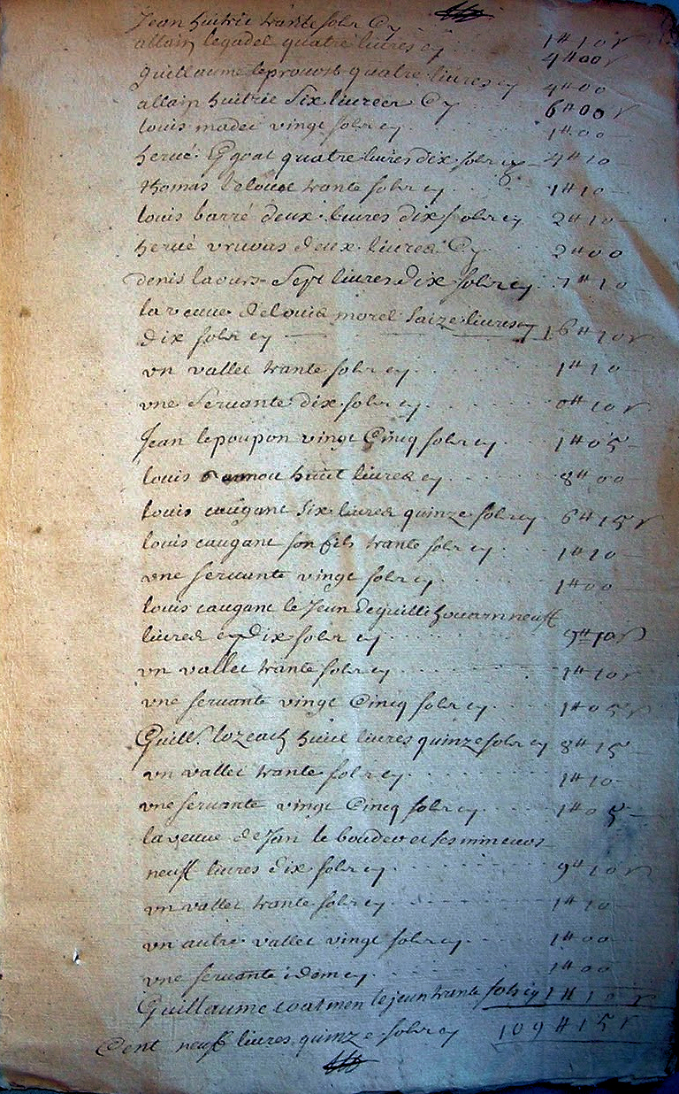 • Source, cote : B 3539, Archives Départementales de Loire-Atlantique (Chambre des comptes, Capitation de tous les contribuables, Rôles de l’Évêché de Quimper, Paroisses A à F)