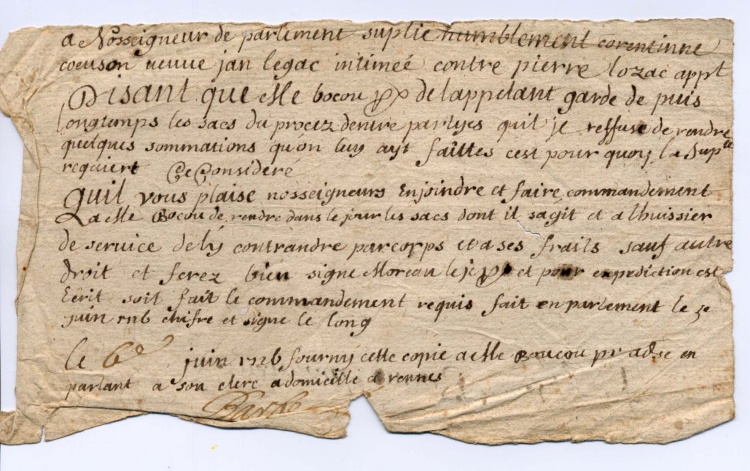 Quil vous plaise nosseigneurs enjoindre a faire commandement a Me Bocou de rendre dans le jour les sacs dont il s’agit et a l'huissier de service de l’y contraindre par corps et a ses fraits sauf autre droit et ferez bien signe Moreau le je (paraphe) et pour expediction est écrit soit fait commandement requis fait en parlement le 3e juin 1726 chiffre et signe le long