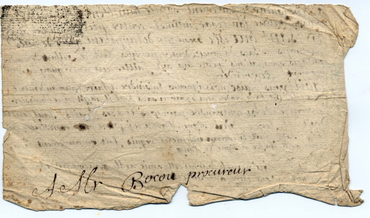 Disant que Me Bocou pr. (procureur ?) de l’appelant garde depuis longtemps les sacs du procez dentre partyes quil reffuse de rendre quelques sommations qu’on luy ayt faittes cest pourquoy le suppléant requiert ce considéré