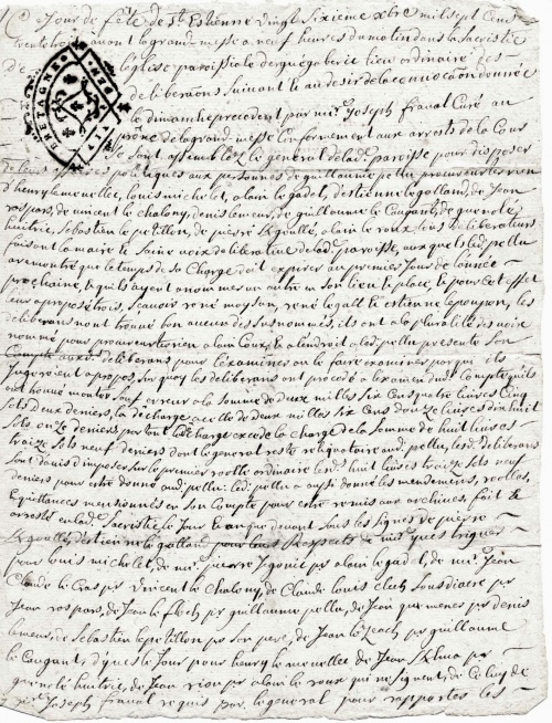 Ce jour de fête de St Estienne vingtsixiéme Xbre (décembre) mille sept cent trente trois an ont la grande messe à neuf heures du matin dans la sacristie de l’église paroissiale dergué gabéric lieu ordinaire des delibéraõns suivant le au desir des la convocaõn donnée le Dimanche precedent par messire joseph fraval Curé au prône de la grand-messe conformement aux arrests de la cour se sont assemblez le general de la paroisse pour disposer de leurs affaires politiques aux personnes de guillaume pellu procureur terrien, d’henry le mevellec , louis michelet, alain, alain le gadel, d’estienne le galland, de jean rospart, de vincent le chalony, denis le meur, de guillaume le caugant, de guénolé huitric, sebastien le petillon, de pierre K/goullé, alain le roux tous Déliberateurs faisant (la maise le saine voix de liberatine ?) de la dite paroisse, auxquels ledit pellu aremontré que le temps de Charge doit expirer au premier jour de l’année prochaine, lequels ayent a nommer un autre en son lieu et place, ce pour cet effet leurra proposé trois, sçavoir rené moysan, rené le gall, estienne le poupon, les délibérateurs non trouvé bon aucun des Sus nommés, ils ont a la pluralité des voix nommé pour procureur terrien alain coux, ce alendroit a ledit pellu presente son Compte aux dits Déliberateurs pour l’examiner ou le faire examiner parqui ils jugent voient apropos , Sur quoy les déliberateurs ont procédé a l’examen du dit Compte qu’ils ont (honné ?) montrer sauf erreur a la somme de deux mille six cens quatre livres cins sols deux deniers, la décharge acelle de deux mille six cent douze livres dix huit sols ou le Denier par tout decharge excede la charge de la somme de huit livres et treize sols neuf deniers dont le general reste reliquataire au dit pellu, les dits Deliberateurs sont d’avis d’imposer sur le premier (roole ?) ordinaire les dits huit livres treize sols neuf deniers pour estre donné au dit pellu : le dit pellu a aussi donné les mendements, (roolles ?) et quittances mentionnés en son compte pour estre remis aux archives ,fait le (arse…,) en ladite sacristie,le jour de l’an que de nont sous les signes de pierre K/goullé ,d’estienne le galland pour leurs respects de messire yves triguer pr louis michelet , de moi pierre (jegonic ?) pr alain le gadel et de même jean claude le cras pr vincent le chalony,de claude louis clech Sousdiacre par jean rospart,de jean le floch pr guillaume pellu, de jean guemenes pr denis le meur, de sebastien le petillon pr son pere,de jean lozeach pr guillaume le caugant, d’yves le jour pour henry le mevellec de jean K/hua pr guénolé huitric, de jean riou pr alain le roux qui ne signent, de celuy de (prêtre ?) joseph fraval requis par le general pour rapporter (fin de la première page)…