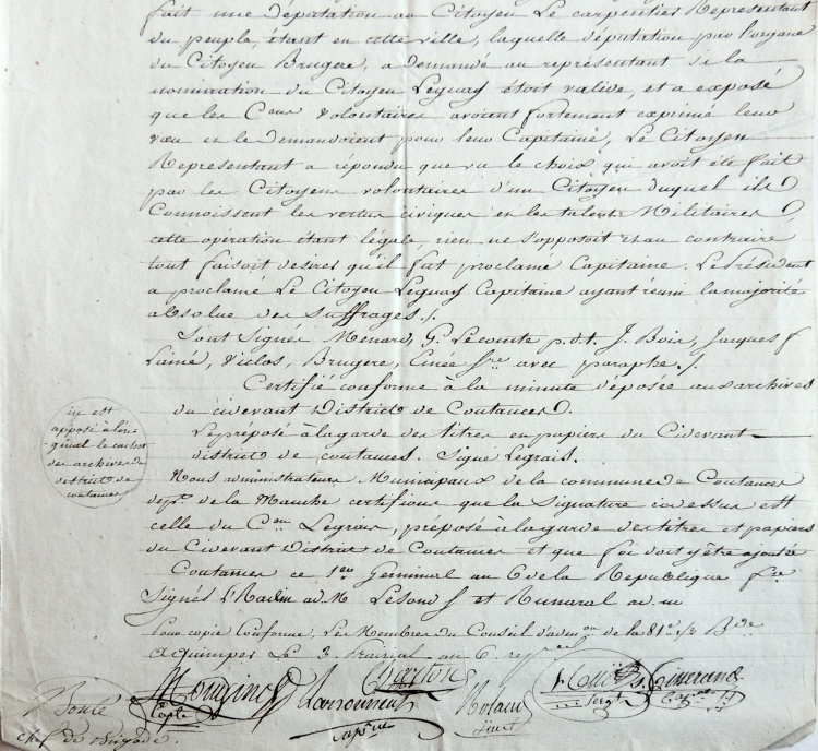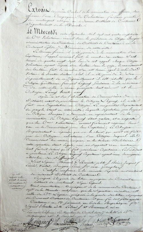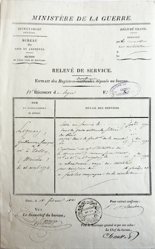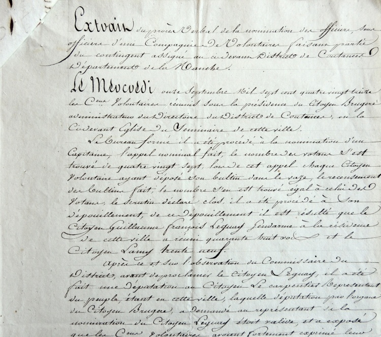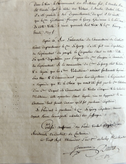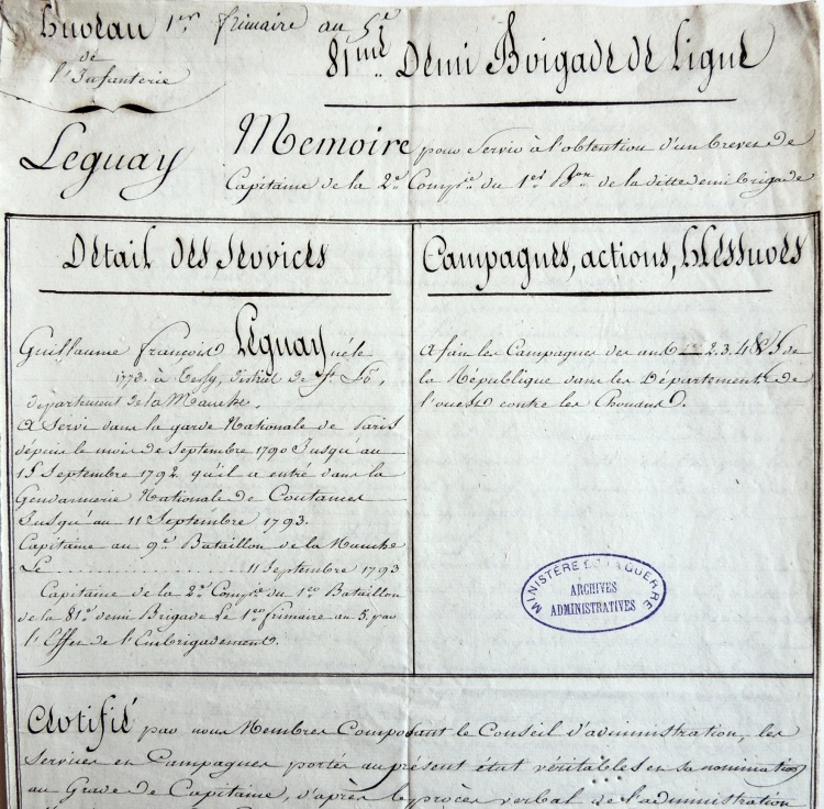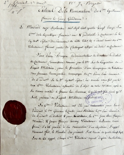 Examinons les différentes affectations et faits d'armes de ce jeune normand, fils d'aubergiste de la commune Tessy-sur-Vire en plein bocage normand. 1790-1792 : Garde Nationale de ParisDès septembre 1790 il quitte sa Normandie natale pour rejoindre Paris où il entre « volontairement, à l'âge de 16 ans, dans la Garde nationale soldée de Paris (compagnie Mornier) ». La Garde nationale est une milice citoyenne française destinée au maintien de l'ordre et à la sécurité intérieure. La première Garde nationale créée est celle de Paris, le 14 juillet 1789. Craignant un débordement populaire, la municipalité de Paris crée une garde parisienne et des volontaires issus des couches les plus aisées de la société y adhèrent spontanément. Le fait de voter en 1790 l'attribution de soldes permet à des volontaires moins aisés comme Guillaume Le Guay de s'enrôler. Une autre caractéristique de la Garde nationale était l'élection au scrutin secret des capitaines, lieutenants et sous-lieutenants. Cette pratique se poursuivra au sein des premiers bataillons de volontaires de l'Armée révolutionnaire (cf. ci-après l'élection de Guillaume Le Guay comme capitaine). 1792-1793 : Gendarmerie Nationale de Coutances En septembre 1792 il revient au pays pour intégrer le nouveau corps de la Gendarmerie nationale, à Coutances (38 km de Tessy) et devient « gendarme à la résidence de cette ville (compagnie Lasalle) ». La maréchaussée royale était responsable du maintien de l'ordre dans le royaume de France sous l'Ancien Régime, et est remplacée en 1790 par la gendarmerie nationale. Contrairement aux Gardes nationaux des principales villes françaises, la gendarmerie nationale est chargée essentiellement de la police des campagnes. 1793 : Capitaine élu au 9e Bataillon de la Manche Le 11 septembre 1793 Guillaume Le Guay est élu capitaine au 9e bataillon de la Manche : « Le président a proclamé le citoyen Leguay capitaine ayant réuni la majorité absolue des suffrages ». Le vote se déroule dans l'église du séminaire de Coutances et 87 soldats du tout nouveau bataillon sont appelés à déposer un bulletin secret. Le résultat proclamé est de 39 pour le citoyen Lamy et de 48 voix pour Guillaume Leguay : « un citoyen duquel ils connaissent les vertus civiques et les talents de militaires ». Le chef du 9e bataillon de la Manche, nouvellement créé, était le Coutançais Michel-Louis-Joseph Bonté 1793 : Blessé au siège de Granville En fin d'année 1793, on le trouve défendant la ville de Granville contre les assaillants chouans. Le 5 novembre, il est même « blessé à la jambe gauche au siège de Granville le 15 brumaire an 2 ». Mais peut-être faudrait-il lire le 25 brumaire ou 15 novembre. Les vendéens sont arrivés en fait devant Granville le 14 novembre, depuis Cholet, Laval, Mayenne, Fougères, Dol, Avranches (la fameuse virée de Galerne). La ville de Granville était défendue par 5 500 hommes commandés par les généraux Peyre et Vachot, et Lecarpentier, représentant du peuple. |