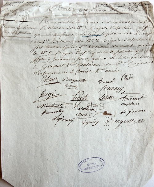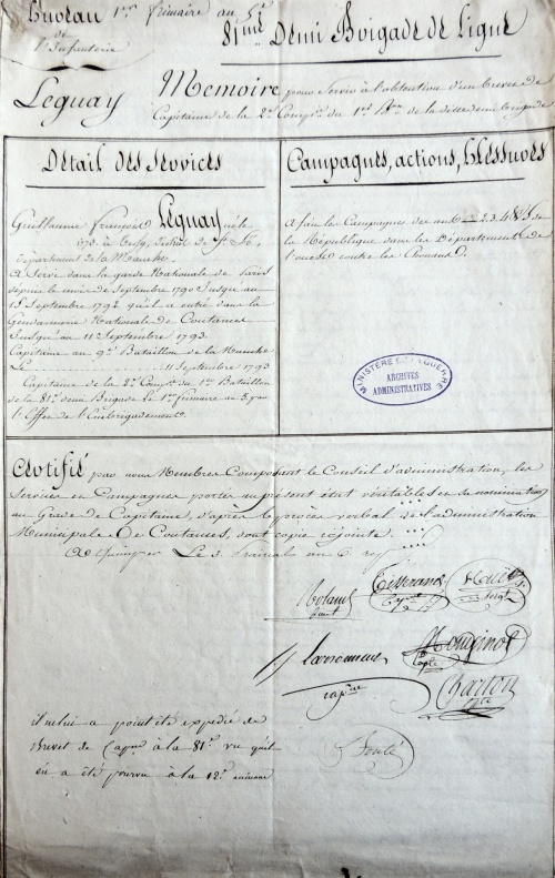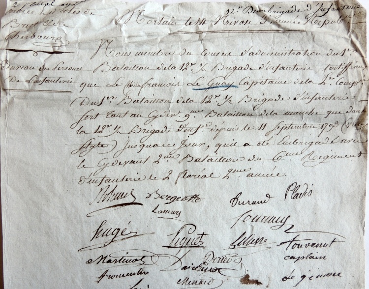 Dans son brevet de capitaine, on lit que Guillaume Le Guay commet un acte de bravoure : « A enlevé un guidon à l'avant garde de l'armée Royaliste composée de cavalerie, il était à cette époque adjoint au général Vachot. ». Le guidon en question est tout simplement le drapeau étendard des compagnies de gendarmerie ou de cavalerie lourde dans les armées de l'Ancien Régime. Réussit-il cet exploit lors des assauts de la cavalerie ennemie, pendant la retraite des vendéens, ou alors pendant une autre échauffourée entre les deux armées ? 1796 : Capitaine à la 81e demi-brigade à Quimper Après le siège de Granville, le 9e bataillon de la Manche intègre la 12e demi-brigade, qui fusionne ensuite dans la 81e demi brigade (nom préféré à régiments qui avait une connotation "Ancien régime"). Guillaume Le Guay et son compatriote Bonté Bonté Après des campagnes dans la région de la Loire, la nouvelle 81e demi-brigade est cantonnée en 1796 à Quimper, avec une double responsabilité : surveiller les côtes de Concarneau à Lesneven et assurer la police à l'intérieur des terres, c'est à dire faire la chasse aux déserteurs et aux chouans, sécuriser les routes, surveiller les prêtres réfractaires, convoyer les prisonniers ... Le 1er frimaire de l'an 5, c'est-à-dire le 21 novembre 1796, il est nommé « Capitaine de la 2e compagnie du 1er bataillon de la 81e demi brigade par l'effet de l'embrigadement ». 1798 : Prisonnier lors de l'expédition d'Irlande Cf article détaillé : « 1798 - Expédition d'Irlande et libération du capitaine Guillaume François Leguay » ¤ 1799-1804 : Capitaine des grenadiers à Quimper La carrière de Guillaume Le Guay ne fut pas aussi fulgurante que celle de Michel Bonté En 1804, sur son entête de lettre, il signe « Le Guay capitaine de la 1ère compagnie de grenadiers au 81e régiment d'infanterie», ce qui semble attester une certaine fierté de faire partie de cette troupe d'élite qu'était le corps des grenadiers Pendant la période 1799-1804, Guillaume Le Guay ne reste pas cantonné à Quimper, étant impliqué dans les opérations militaires de son régiment, notamment au corps d'observation du midi : « A fait (la campagne) d'observation du midi en Italie ». Par contre il ne participera pas à la campagne d'Italie de fin 1805, car, en conflit avec son ancien Bonté pour des raisons familiales, il abandonnera son métier de militaire pour s'établir définitivement au Cleuyou en Ergué-Gabéric, près de Quimper. |