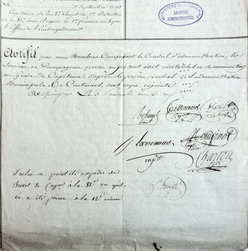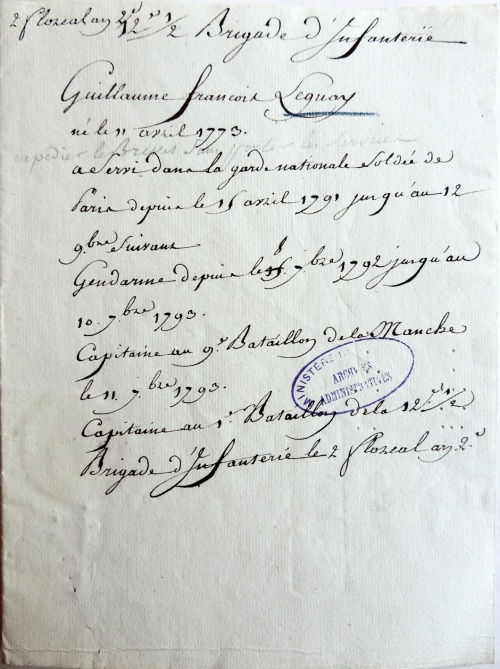 Les documents d'un dossier conservé au SHD (Service Historique de la Défense) à Vincennes retraçant une carrière militaire exceptionnelle d'un jeune normand qui viendra ensuite s'installer au château du Cleuyou en Ergué-Gabéric. Merci à Michel Le Guay pour nous avoir fait connaître ces documents relatifs à son ancêtre, et également cet article instructif « Vent de Galerne : un Lorrain dans la tourmente révolutionnaire bretonne » écrit par Roger Tanguy dans la revue « Le Lien » (ex. 133, mars 2015) du C.G.F. ( Centre Généalogique du Finistère). | |||||