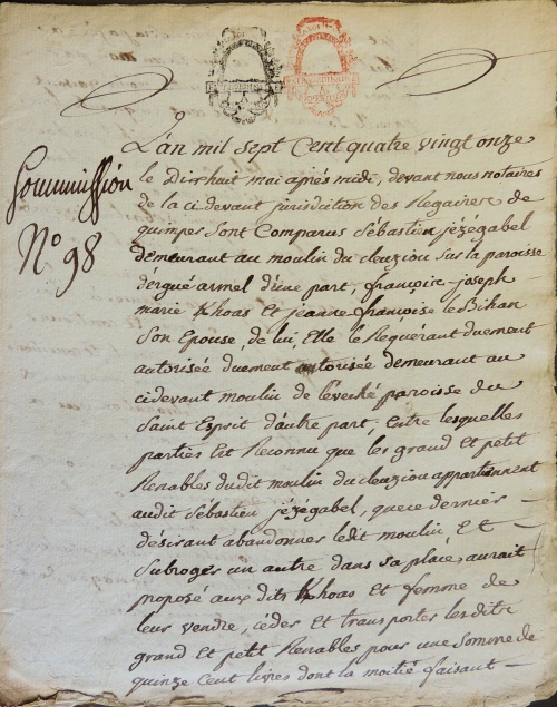 L'an mil sept cent quatre vingt onze le dix huit mai après midi, devant nous notaires de la ci-devant juridiction des Regaires [2] de Quimper sont comparus Sébastien Jézégabel demeurant au moulin du Cleuziou sur la paroisse d'Ergué Armel d'une part, François-Joseph Marie Kerhoas et Jeanne-Françoise Le Bihan son épouse, de lui elle le requérant duement autorisée demeurant au ci-devant moulin de l'eveché paroisse de St-Esprit d'autre part ; entre lesquelles parties est reconnu que le grand et petit renables [1] dudit moulin du Cleuziou appartiennent audit Sébastien Jézégabel, que ce dernier désirant abandonner ledit moulin, et subroger un autre dans sa place, aurait proposé aux dits Kerhoas et femme de leur vendre, céder et transporter les dits grand et petit renables [1] pour une somme de quinze cent livres dont la moitié faisant